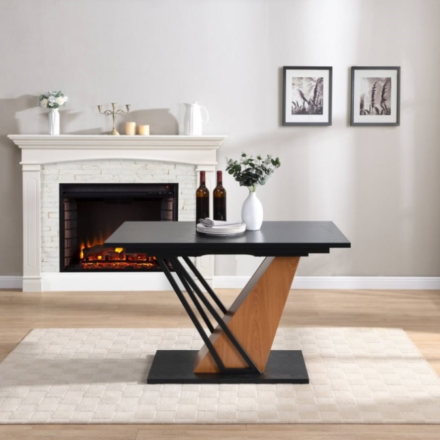 Modern Geometric Aesthetic – Featuring an innovative slanted metal support structure, combined with a stylish contrast of black and wood tones, this table enhances any space with a contemporary and sophisticated look.