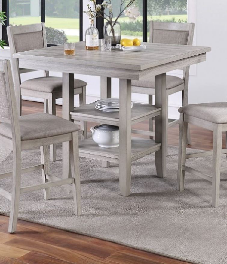 Contemporary StyleRustic Pearl GrayCushioned SeatsWooden TopShelves base TableUpholstered CushionsListing Includes :- Counter Height Dining Table, 4x High Chairs Only. Product Description Product Description:- This counter height table dining set is a perfect center piece for your dining room. Designed and crafted with clean-lined and sturdy wood, it brings a sense...