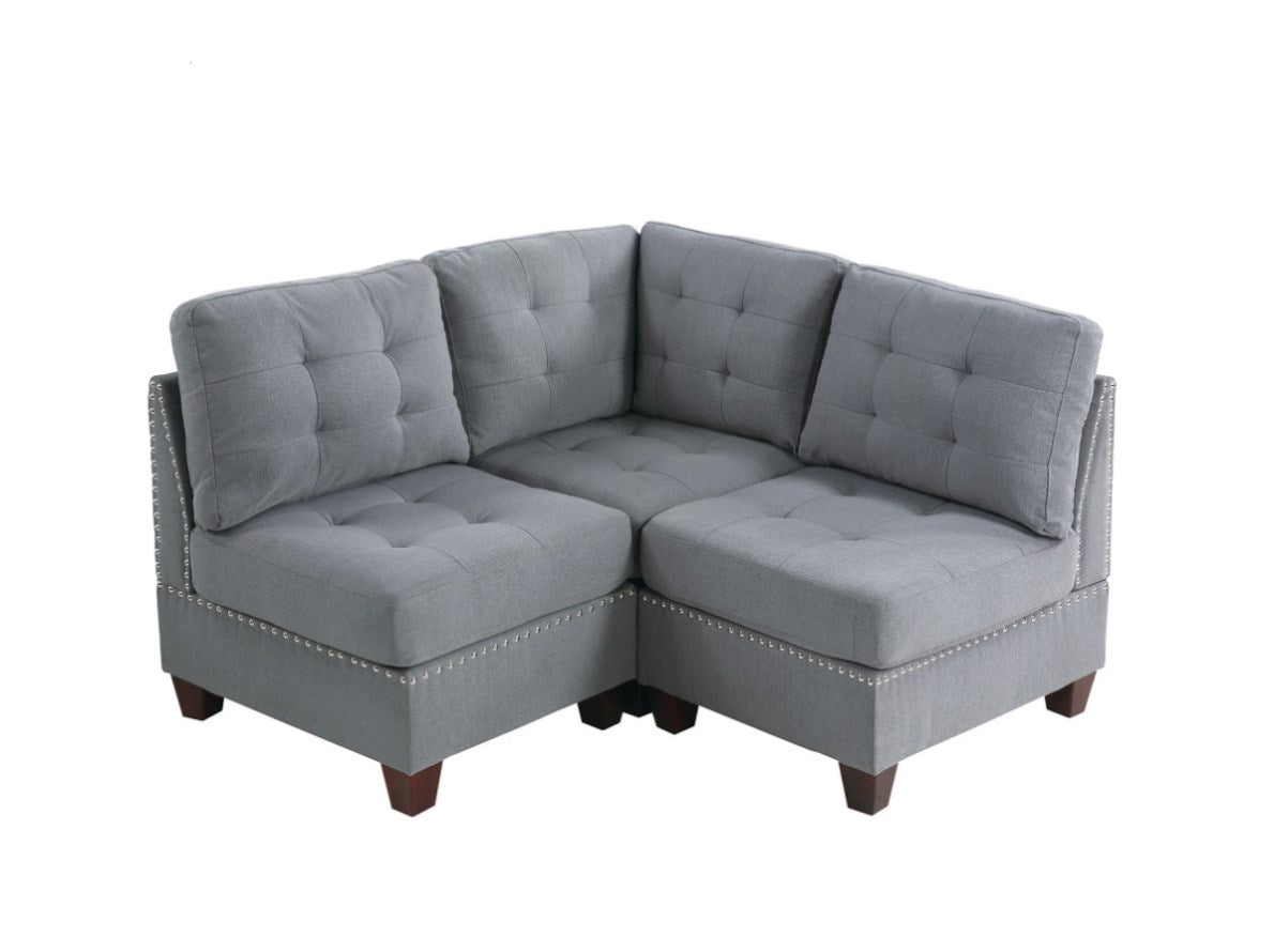 Product Description:- Combining simple form factor with special care paid attention to the finishing trim, this adjustable set brings elegance with a flair of classic decadence. With Armless Chair, (Optional Corner and ottoman) you can create a set that fit your exact need. Let this piece that comes in rustic dark bring the most optimal comfort to you and your guests, while displaying your taste for the classics. It will bring attention into your living living room. Product Features:- u2022Contemporary Style u2022Gray Color u2022Linen Like Fabric u2022Wood u2022Tufted Cushion u2022Nailheads u2022Plush Couch u2022wood Leg