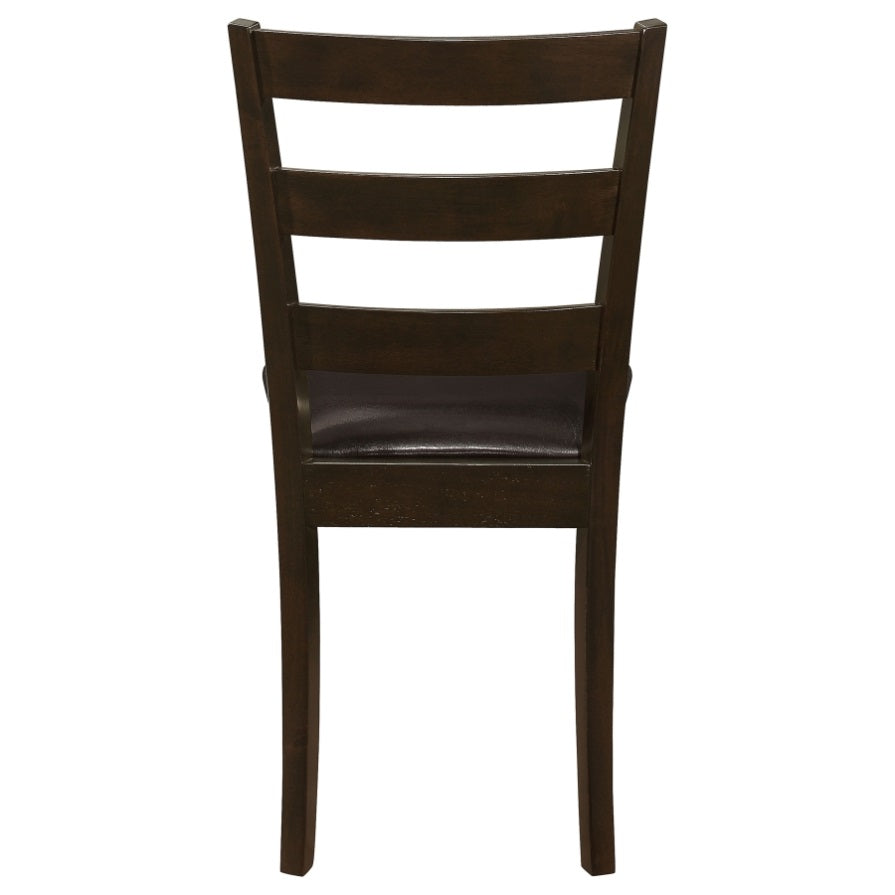 Ladder back chairs include padded dark brown leatherette seats, providing comfortable seating with a classic design touch