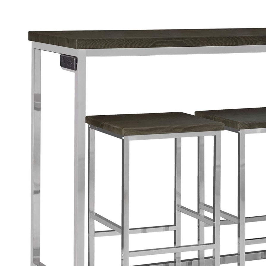 Stylish and versatile, this modern four-piece counter height table set models a cafe-style ensemble perfect for casual dining or working, and includes a table with three stools. A rustic, scratch-resistant dark oak finish tabletop and chair seats over chrome finish legs offer an upscale look, as a built-in power unit provides two AC outlets and two USB ports for workspace efficiency.