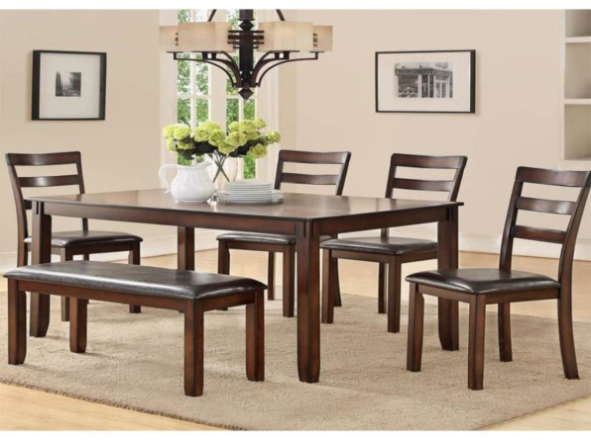 Set Includes: One (1) Dining Table, Four (4) Dining Chairs and One (1) Bench