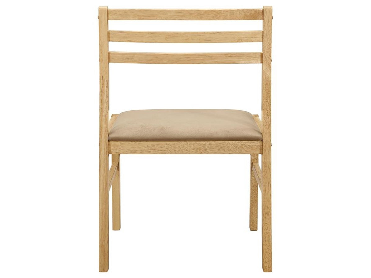 Your breakfast nook or compact dining area will feature casual style with this three-piece dining set. It's made from light-colored Asian tropical wood, and the drop-leaf table and upholstered, modern ladder back-styled chairs offer convenience, comfort and relaxed good looks.