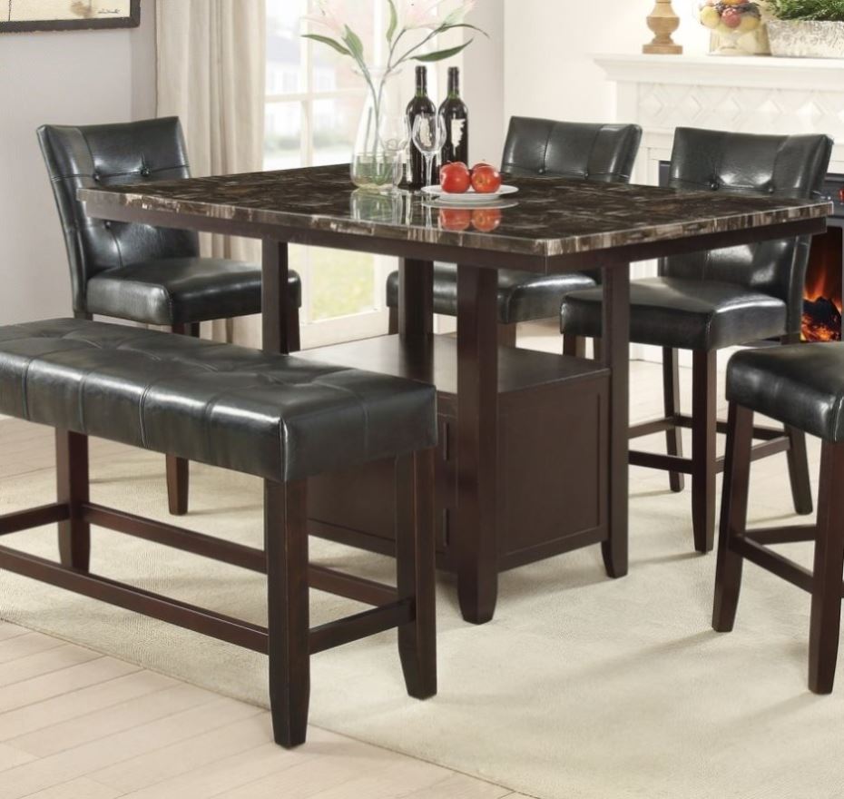 Contemporary StyleBrown FinishFaux marble TopRectangular TopOpen Storage ShelveStorage Base / BottomListing includes - 1pc Counter Height Dining Table Only.Chairs And Bench - Not Included. Product Description Description - Dine in simplistic class with a casual dining set featuring a rectangular shaped faux marble finished countertop trimmed in a rich espresso....