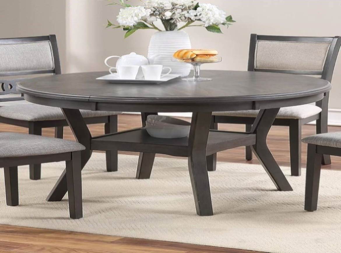 This dining room round table set with elegant wood crafted knot design can transform your dining room into the perfect place to spend time with family and friends. The chairs have upholstered cushions to ensure extra comfort. The whole set includes one table and four dining chairs. Comes in Gray.