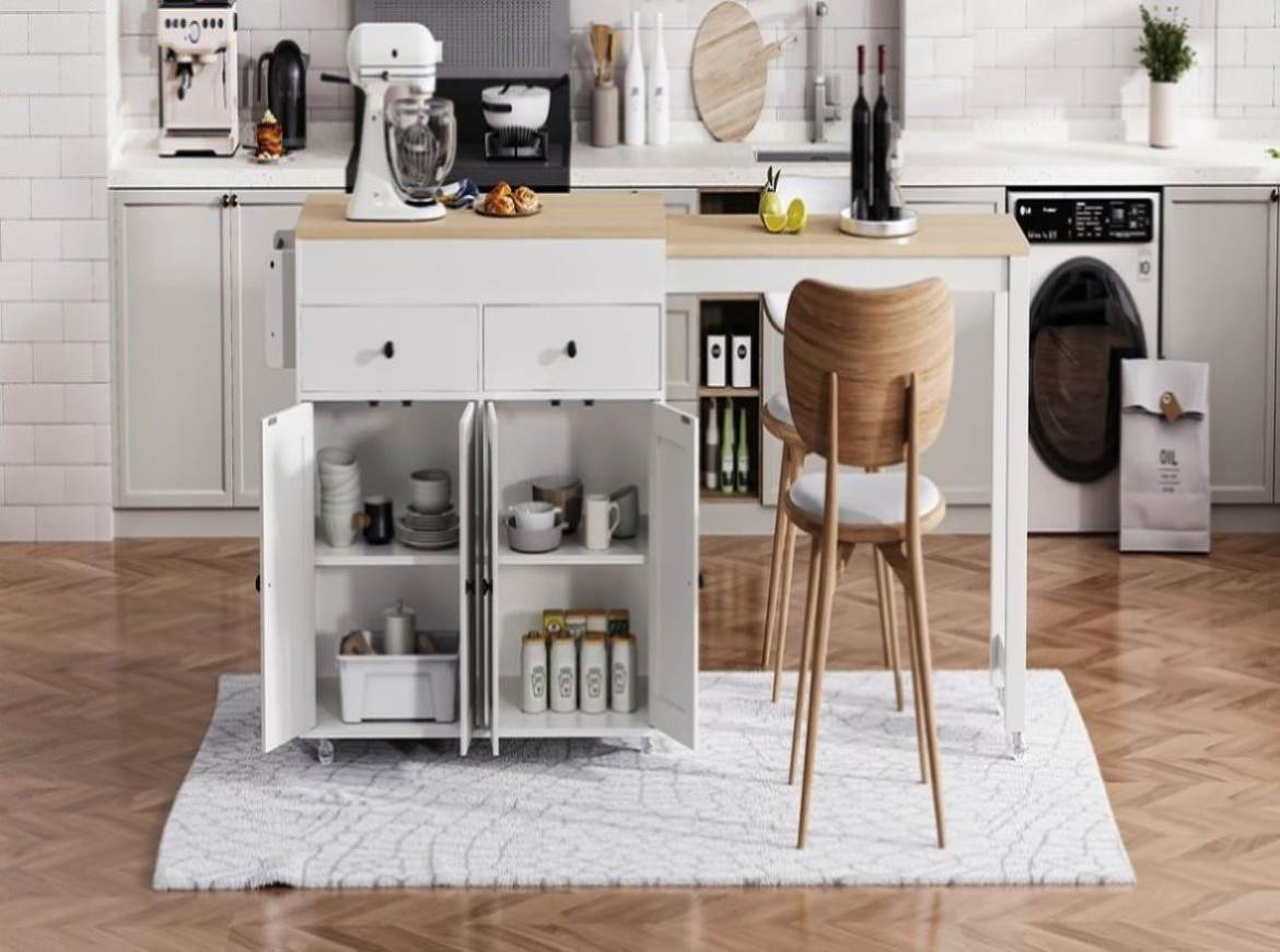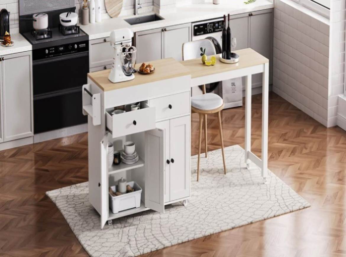 | Summary | This kitchen island is constructed from eco-friendly P2 grade particleboard and MDF, strong, sturdy and durable materials that bring storage product to your kitchen that can be used consistently. The maple-colored table top and solid color product look are very modern in design, making your kitchen space more aesthetically pleasing. The extendable dining table design allows you to enjoy the convenience of food preparation on a large tabletop or extend it for more space when you're short on usable space. In terms of practicality and safety, this extendable table is equipped with 7 wheels, including 4 wheels on the left and right sides that can be locked for easy mobility and stability, 2 drawers and a spice rack for easy storage. You no longer need to worry about kitchen clutter due to a lack of storage space. |