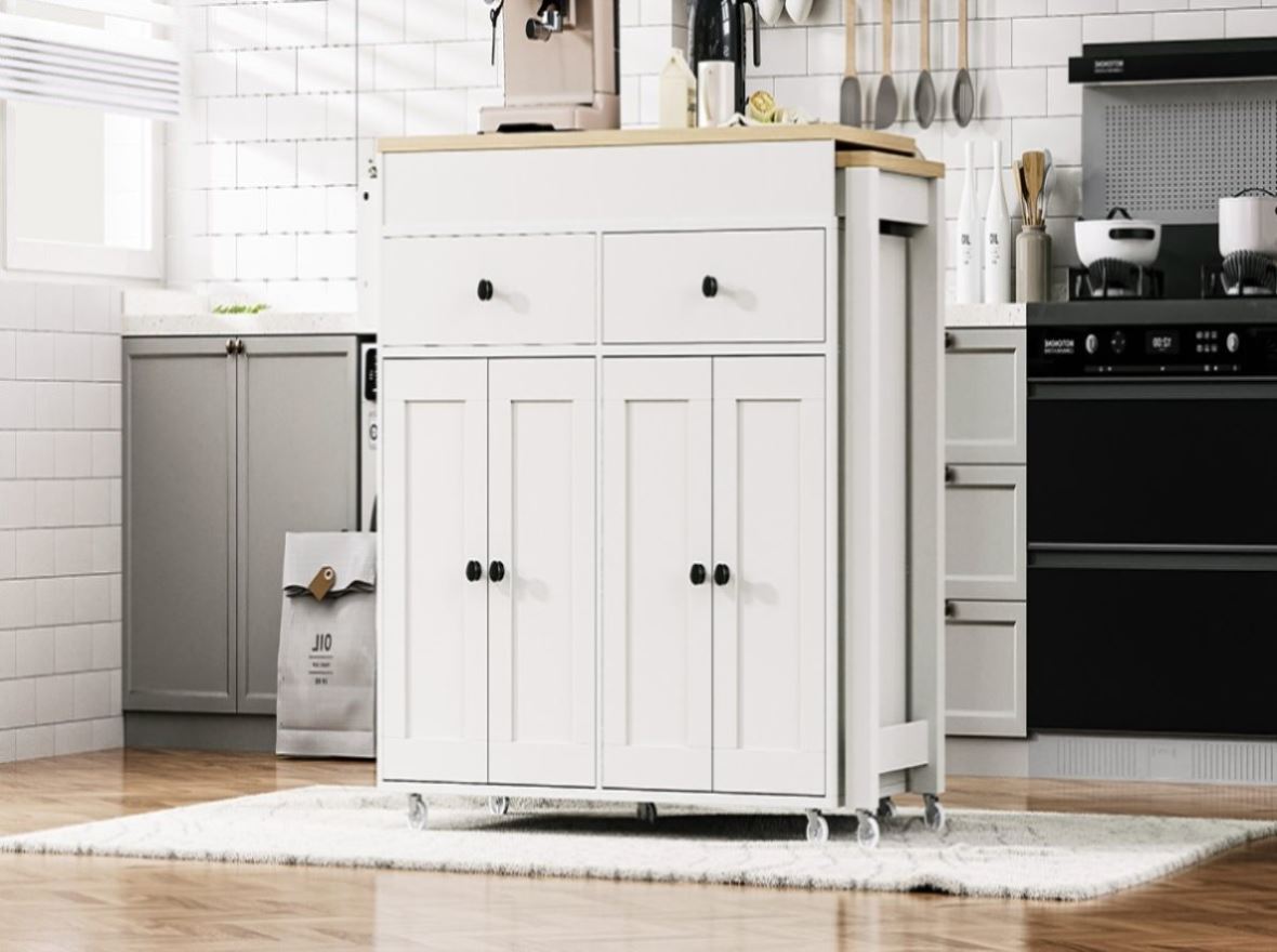 | Highlights | [Space-Saving Design][27" Extendable Dining Table] [44"x19.75" Large island] [Ample Storage Space][Metal Door Panel Pivot] [7*360°Smooth Rotation Wheels with 4 Lockable] [Four Doors + Two Drawers][Spice Rack] [Smooth Metal Slide][Eco-friendly P2 Grade Particleboard+MDF] |