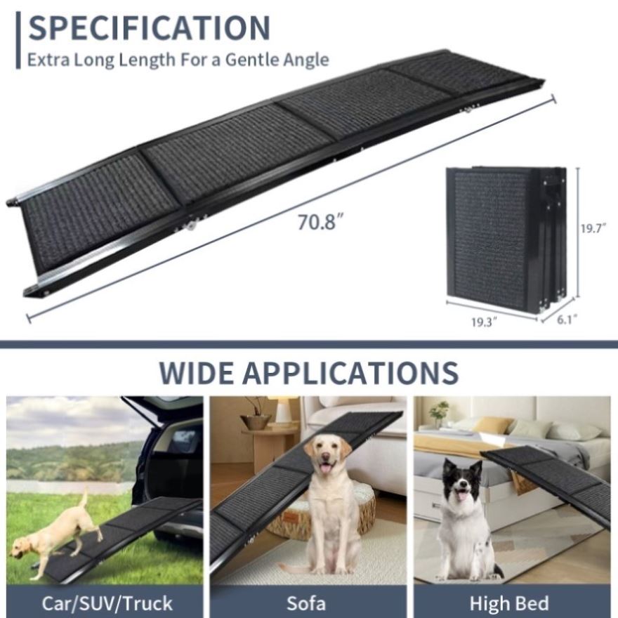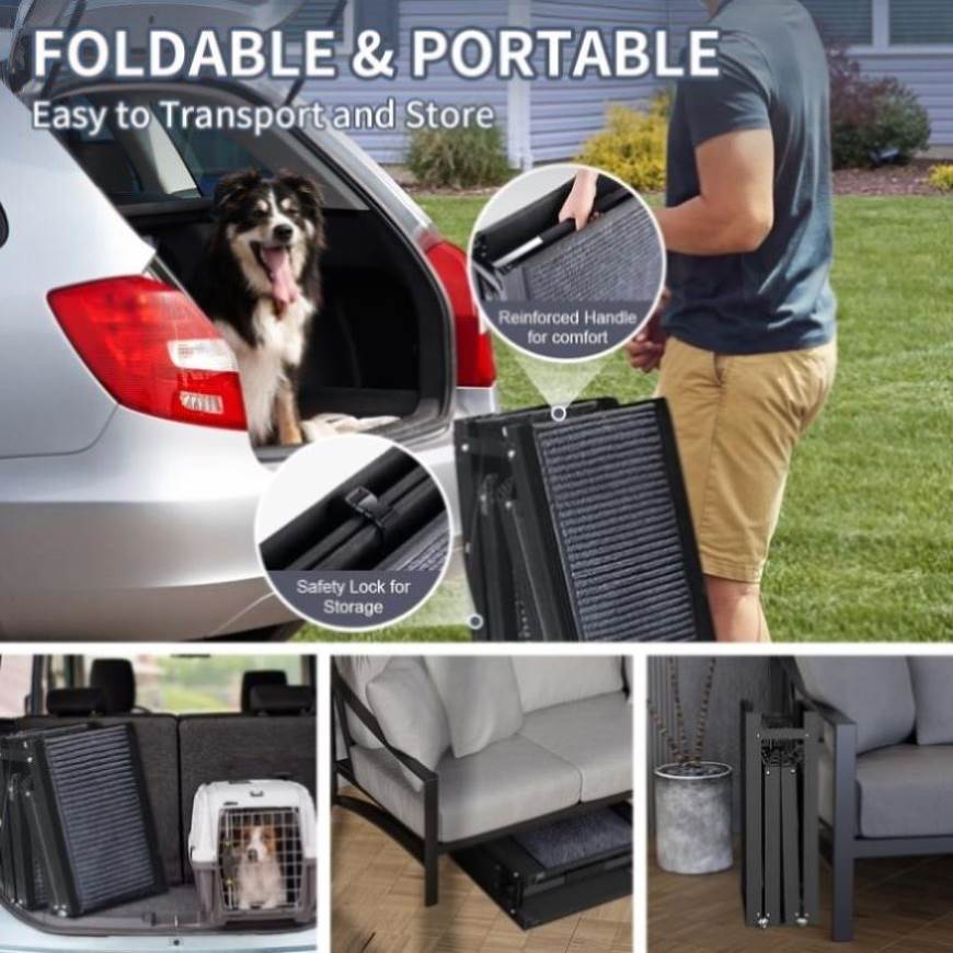 - To enhance portability during travel, we have designed a 4-layer folding system that significantly reduces the size of the dog ramp. This allows it to be easily stored in the trunk or any other place you need it. When folded, an integrated handle makes carrying it effortless.