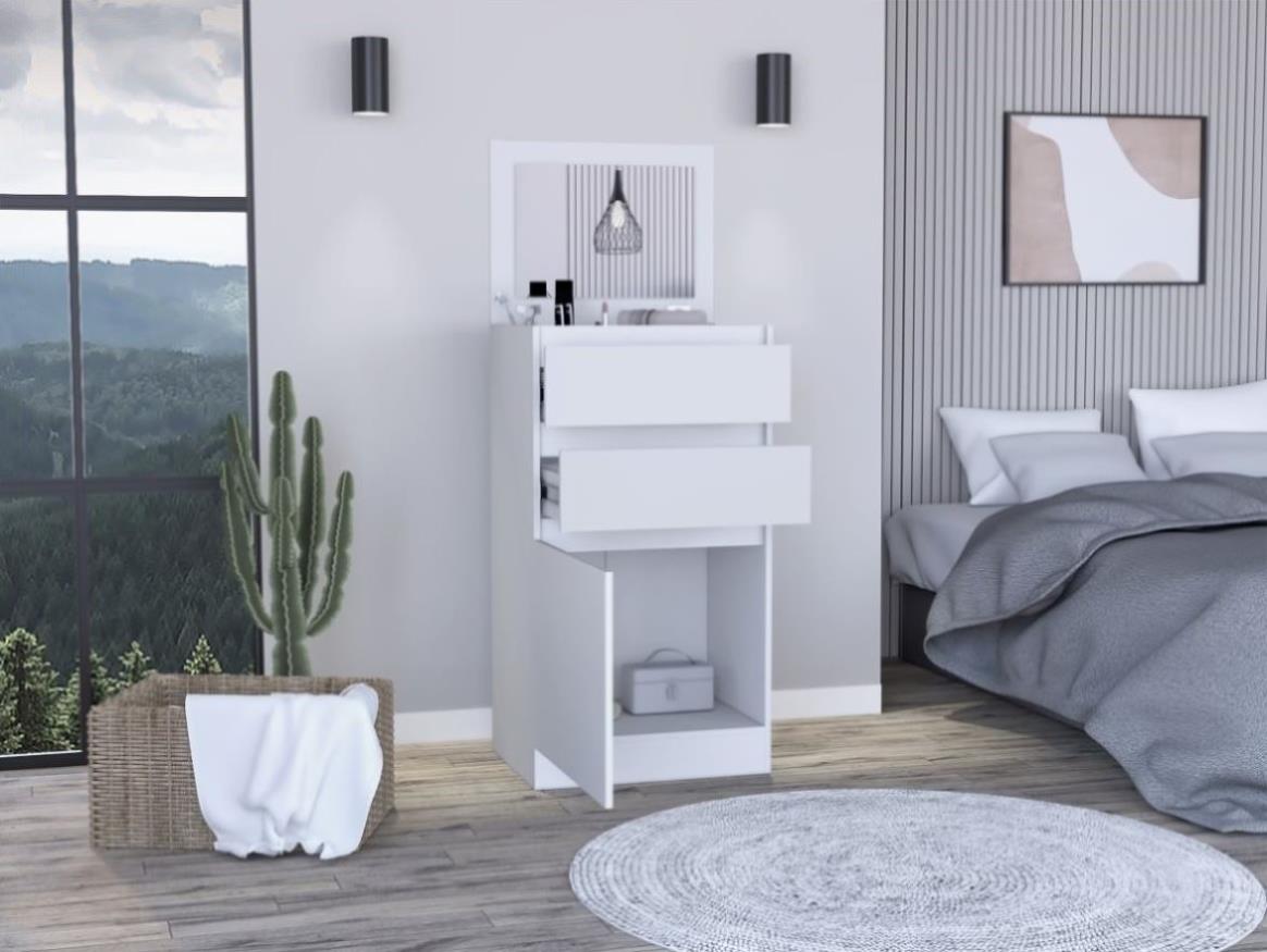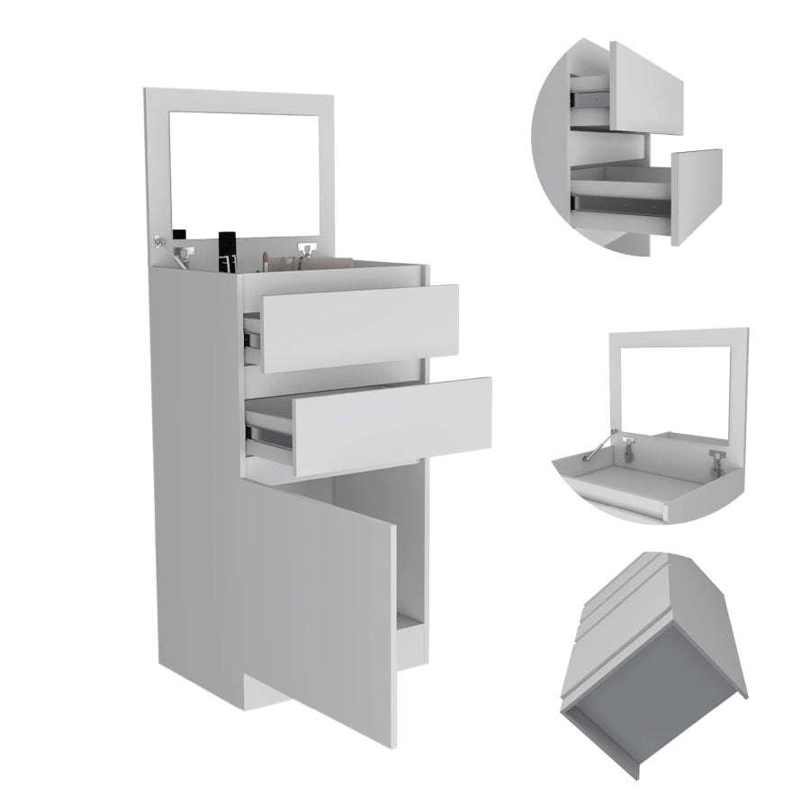 Jewelry boxFlip top mirrorSingle door-cabinetTwo drawers feature Romance Copy Integrate a small compartment beneath the mirror for storing rings or small accessories and consider adding adjustable shelves or dividers inside the cabinet to organize various types of jewelry. The unit features two drawers for convenient storage of clothing, accessories, or...