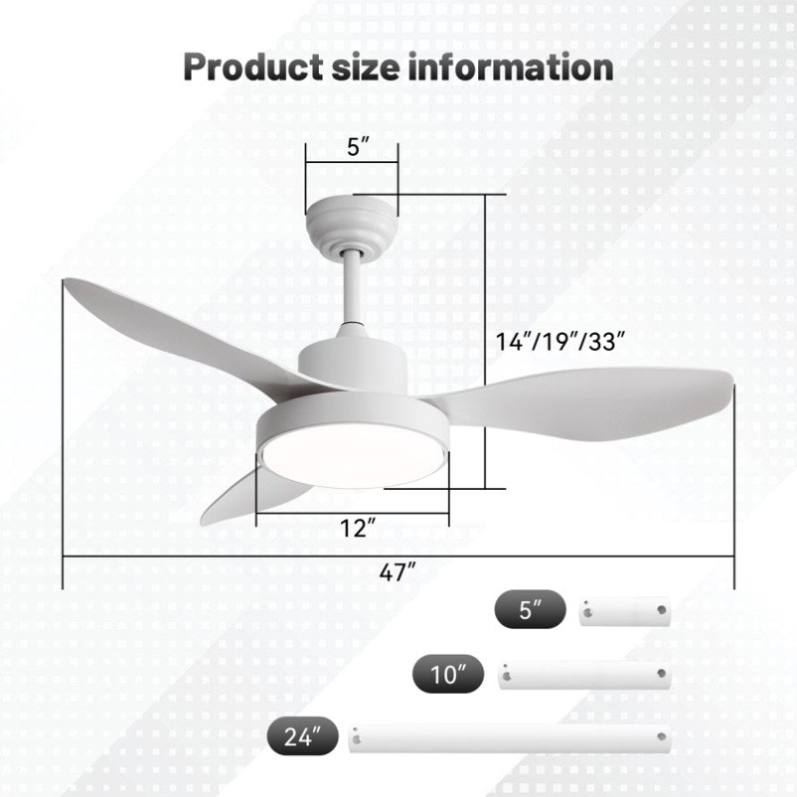 Easy Installation: With a 47-inch diameter and compatibility for ceilings with a maximum slope of 15 degrees, our ceiling fan is designed for easy installation. Most functional components come pre-assembled, allowing you to save on electrician costs and complete the installation on your own.