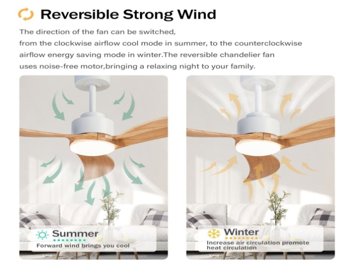 Reversible and Quiet Motor: Equipped with an efficient reversible DC motor, this ceiling fan starts quickly, offers precise speed control, and effectively reduces energy consumption. The quiet design of the DC motor ensures nearly silent operation, providing a peaceful user experience. The reversible function allows the fan to deliver cool breezes in summer and evenly distribute heat in winter, making it suitable for year-round use.