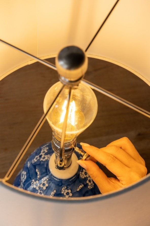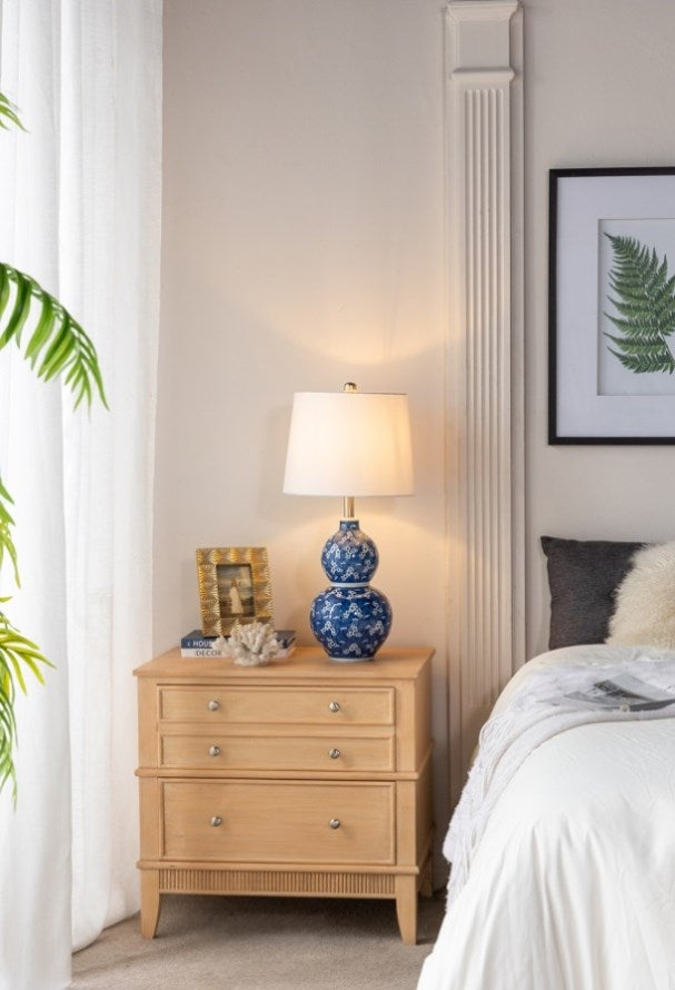 With its unique two-tiered round shape, bold blue hue, and intricate white patterns, this piece offers the playful visuals of an accent vase and the soothing ambiance of a table lamp.