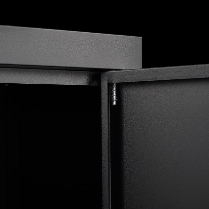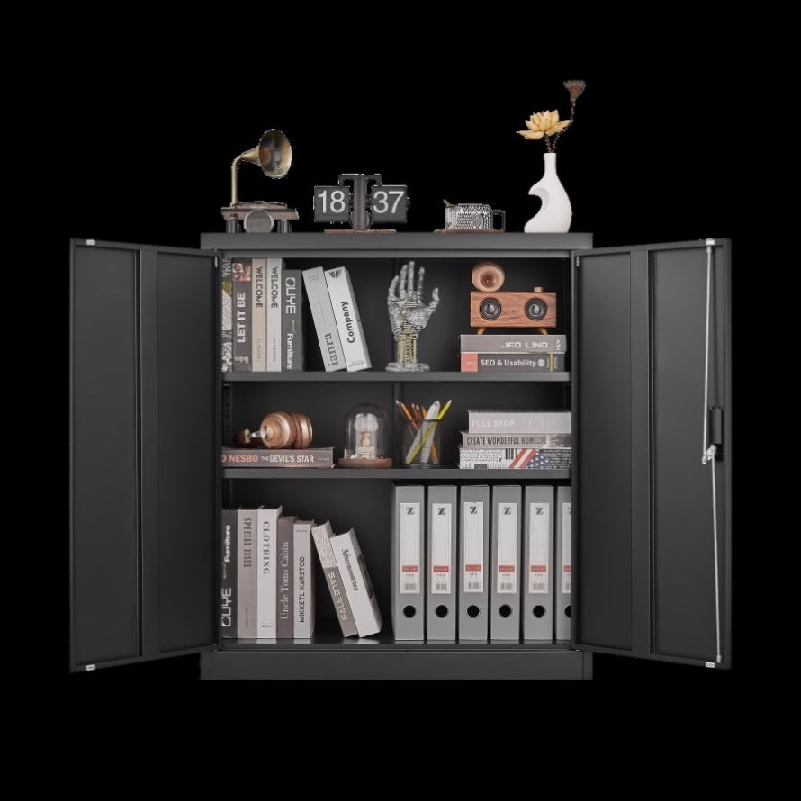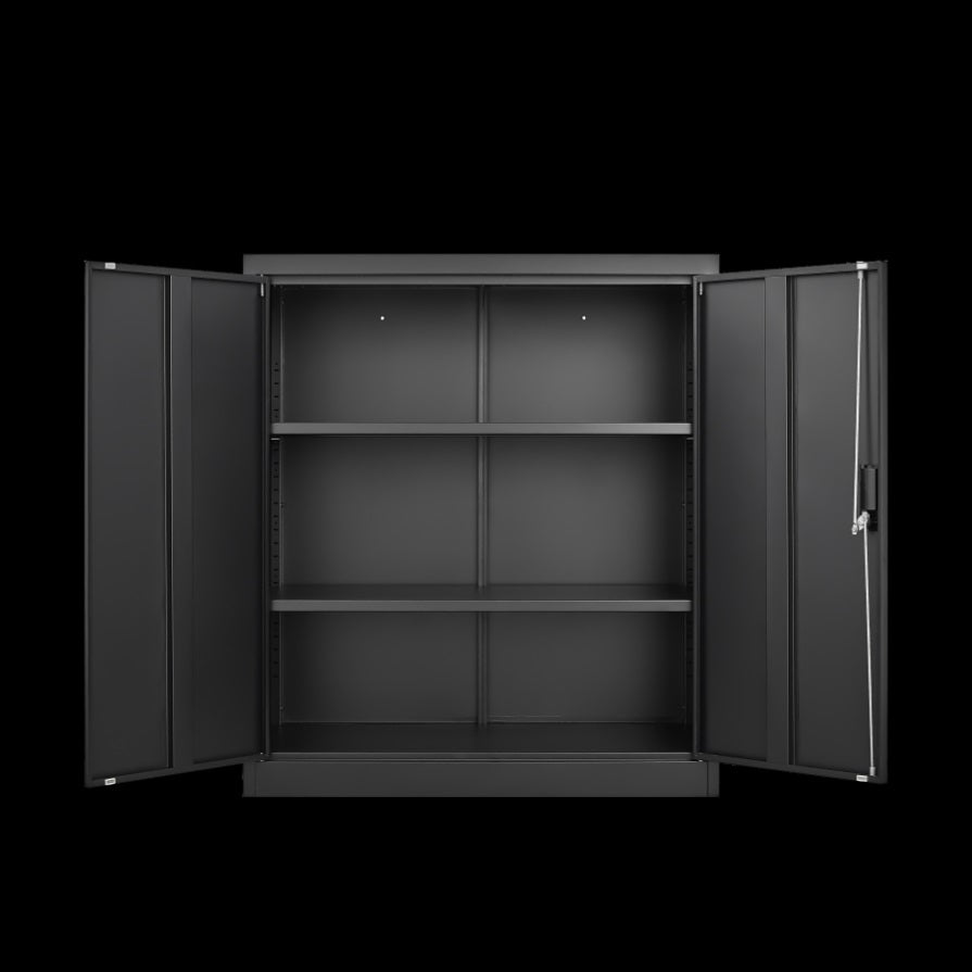 Double-door design with security door lock and two keys for secure storage of private items, suitable for garages, homes, and offices.