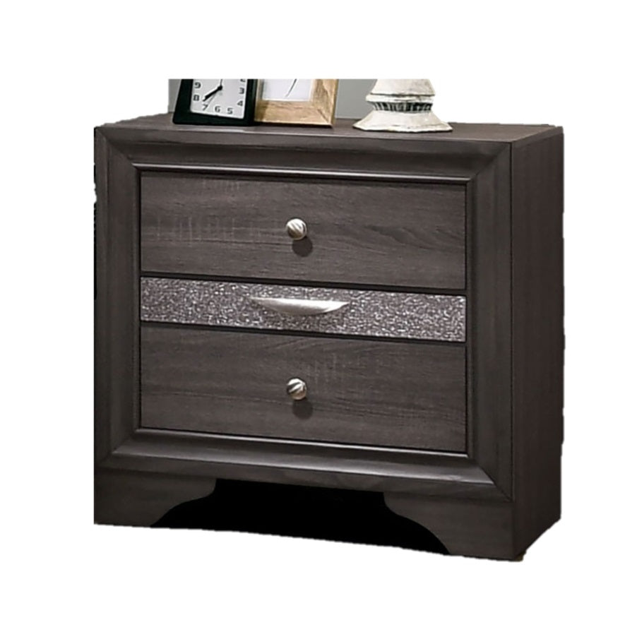 Contemporary StyleGray ColorSolid Wood, Wood Veneer, OthersEnglish Dovetail ConstructionHidden Jewelry DrawerSilver AccentsStorage Drawers Bedside TableListing Includes :- 1x Nightstand Only.Nickel Round Knob Product Description Product Description:- Brighten your room with the sheen and shine that this night stand delivers. The gleaming white finishes promote a refreshingly clean aesthetic with silver...