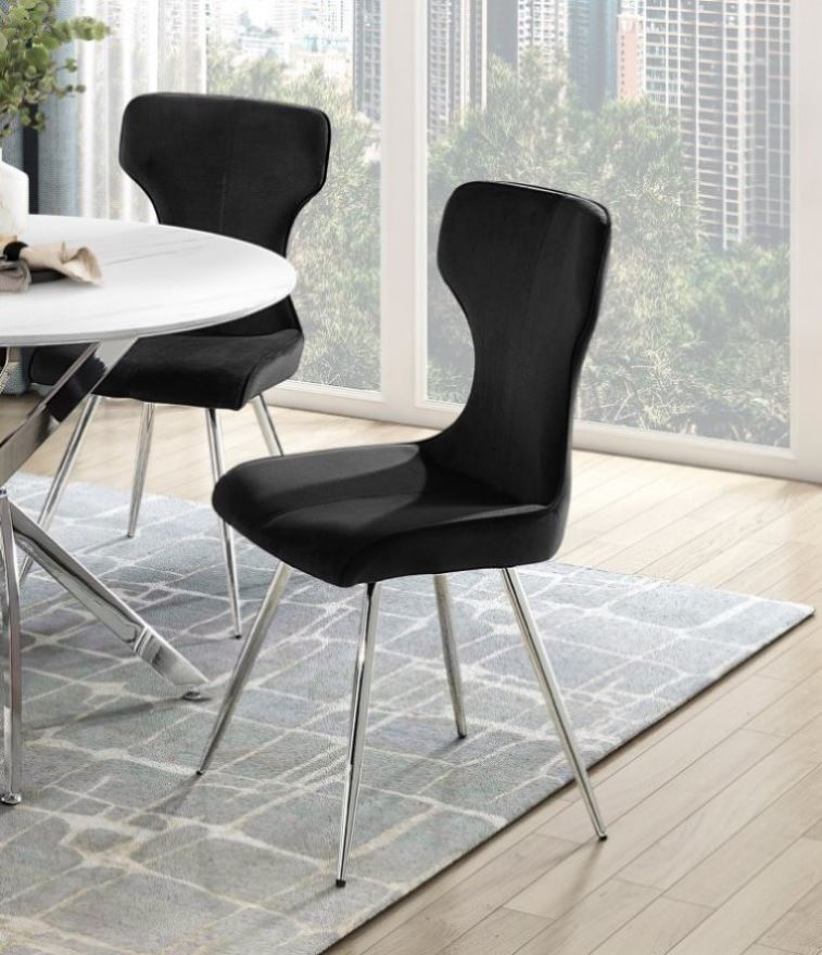 Velvet fabric upholsteryMetal legs in chrome finishWeight capacity: 250lbsFabric Type: Velvet, Fabric Color: Black Description & Dimensions SIDE CHAIR PRODUCT DIMENSIONS: Overall Dimension: 18" x 22.5" x 35.5"H Seat Width: 17.5" Seat Depth: 17" Seat Height: 18.5" Listing Includes: Set of 2 Side Chairs Only. Dining Table: Not Included. Simple...