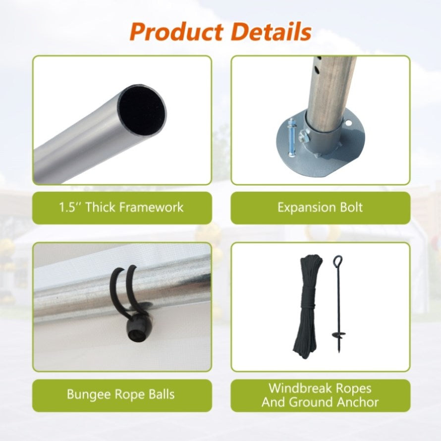 - The party tent frame is made of high-quality materials, rust-proof and corrosion-resistant, and can provide strong support. The tarpaulin uses high-quality PE fabric, which is waterproof and UV-resistant.