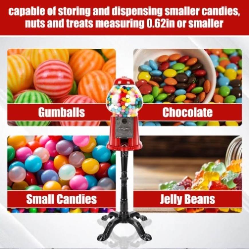 PRODUCT DETAILS - Materials: Glass, Aluminum-Alloy, and Cast-Iron. Dimensions (with Stand): (L) 18" x (W) 18" x (H) 37". Works with Hard Candies Only; Use Gumballs 0.7" Diameter or Less. Choking Hazard - Not for Children under 3. Color: Red.
