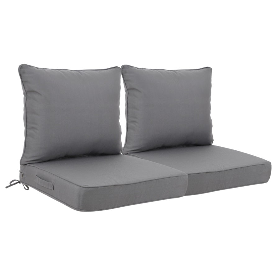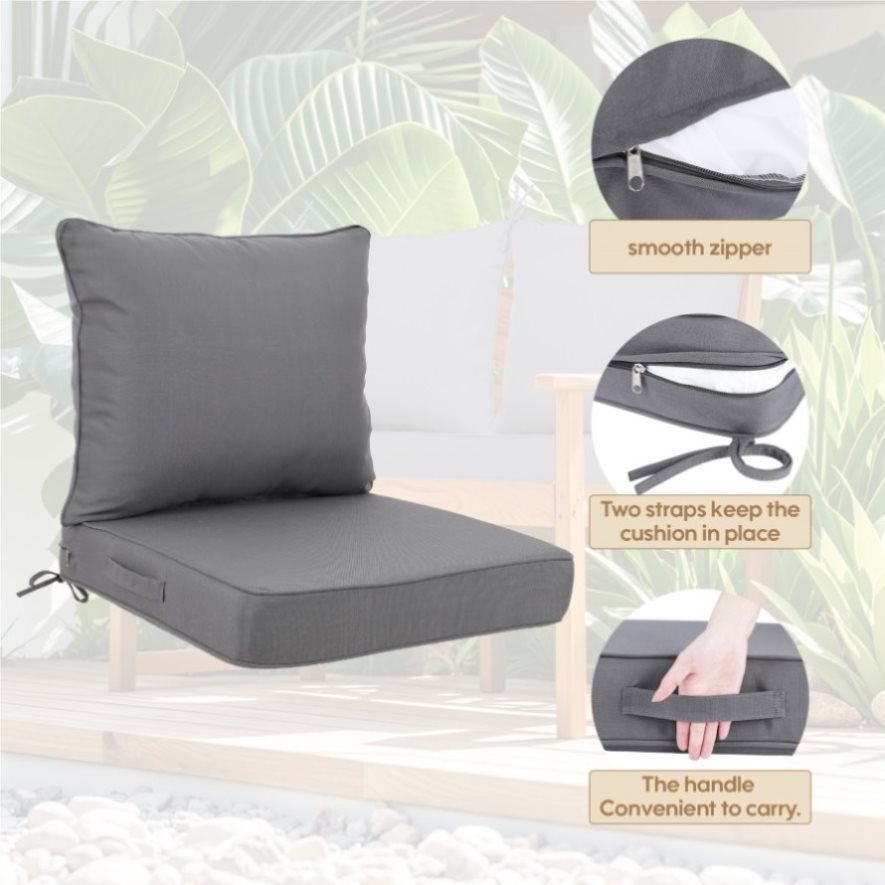 Deep Seat Comfort Upgrade● 24x24 inch oversized design with 4.3-inch thick cushions provides ergonomic support for patio chairs, sofas, or porch swings. Say goodbye to sagging seats! o sagging seats! Both the seat cushion and backrest cushion feature two reinforced straps to ensure a secure and stable fit on chairs, preventing slipping or shifting during use.