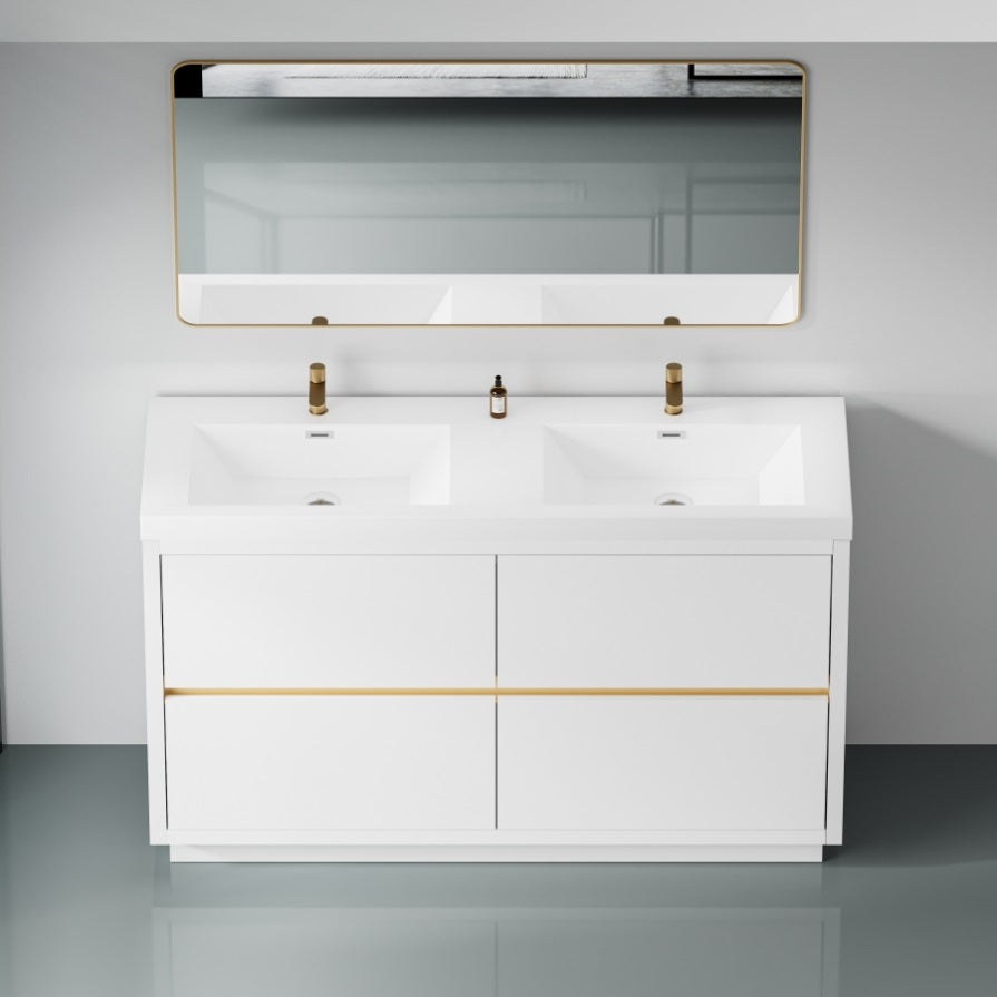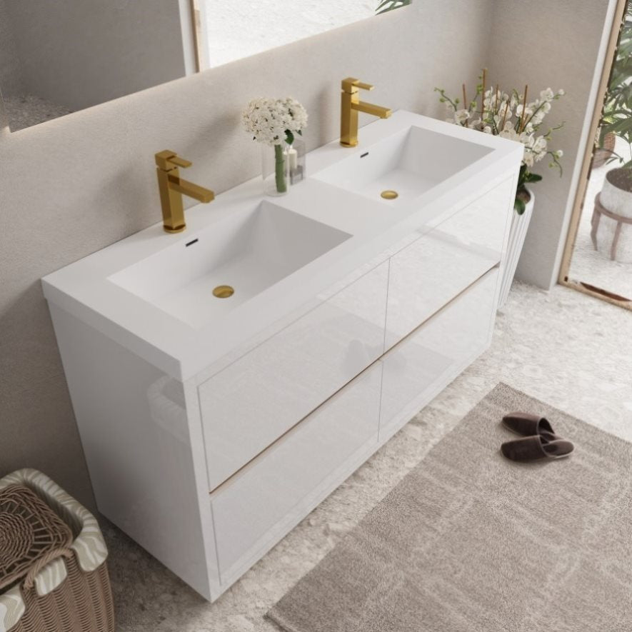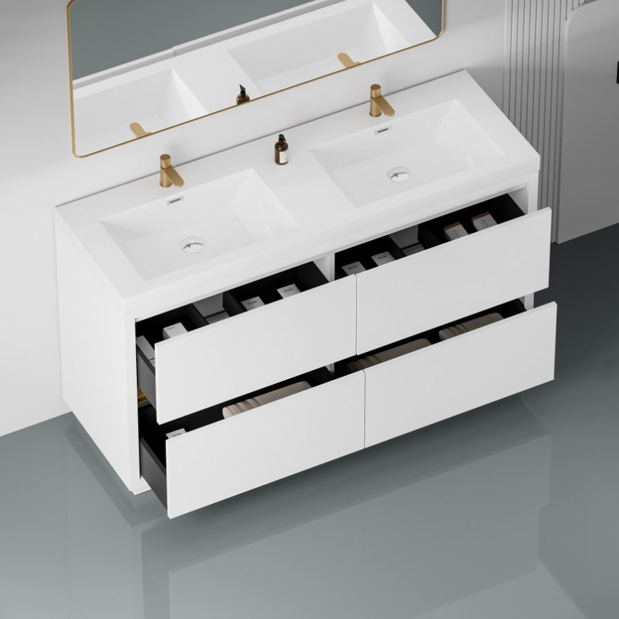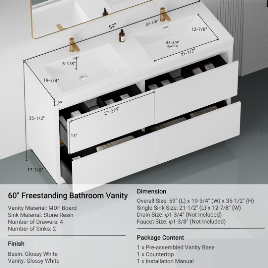 Overall Size: 59" (L) x 19-3/4" (W) x 35-1/2" (H) Single Sink Size: 21-1/2" (L) x 12-7/8" (W) Drain Size: φ1-3/4" Faucet Size: φ1-3/8" Finish: Glossy White Vanity Material: MDF Sink Material: Stone Resin Number of Drawers: 4 Number of Sinks: 2 Package Content 1 x Pre-assembled Vanity Base 1 x Countertop 1 x Installation Manual