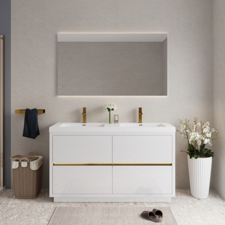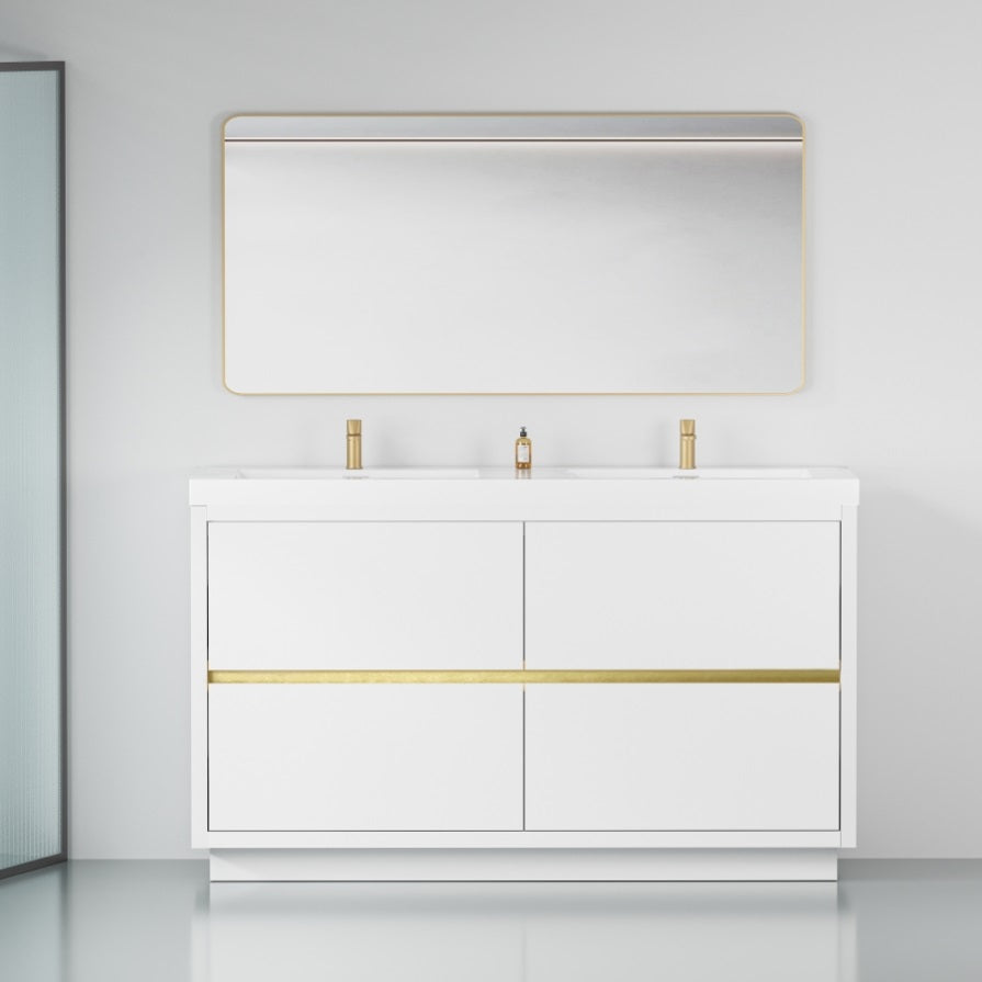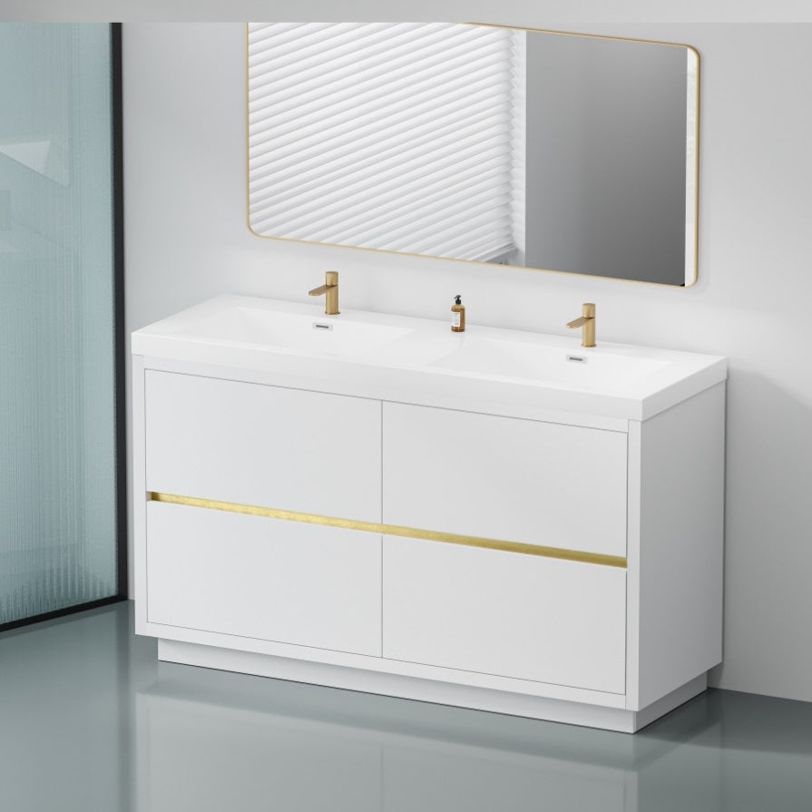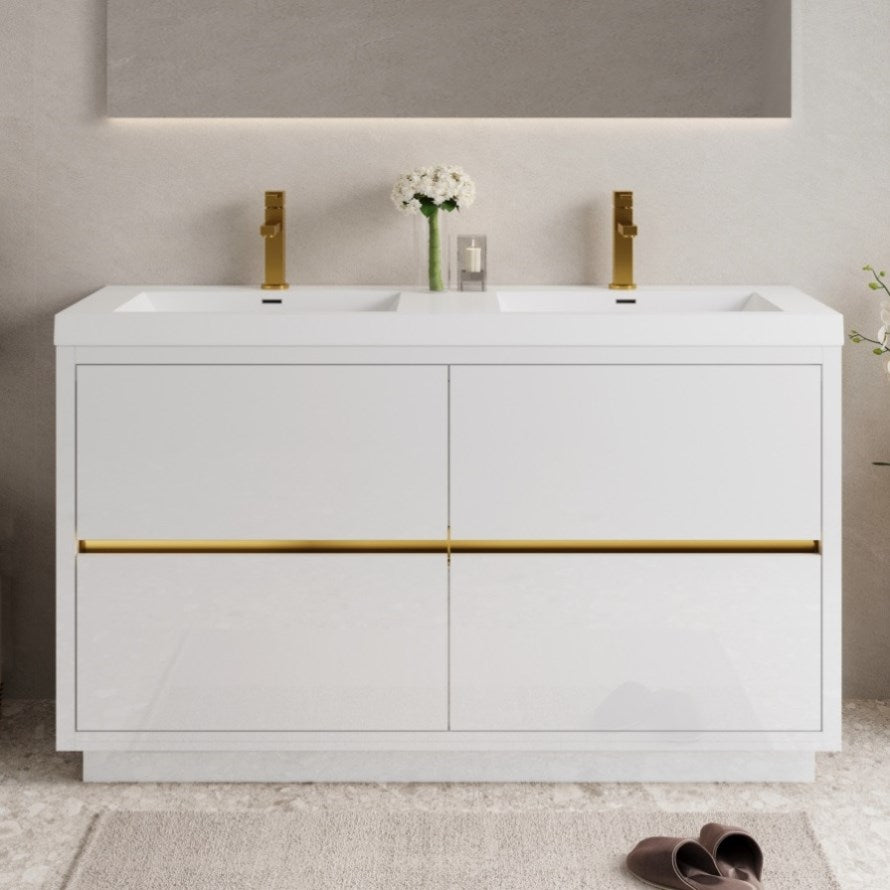 Overall Size: 59" (L) x 19-3/4" (W) x 35-1/2" (H) Single Sink Size: 21-1/2" (L) x 12-7/8" (W) Drain Size: φ1-3/4" Faucet Size: φ1-3/8" Finish: Glossy White Vanity Material: MDF Sink Material: Stone Resin Number of Drawers: 4 Number of Sinks: 2 Package Content 1 x Pre-assembled Vanity Base 1 x Countertop 1 x Installation Manual