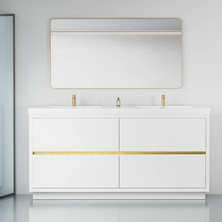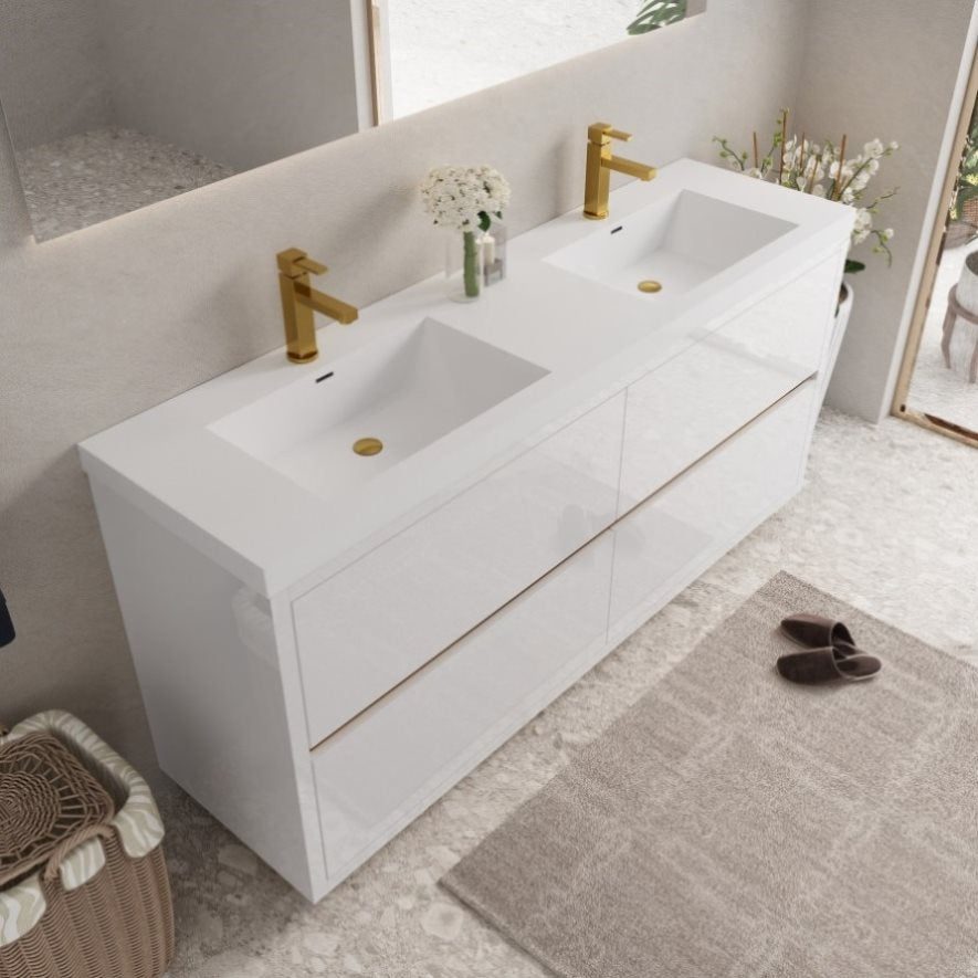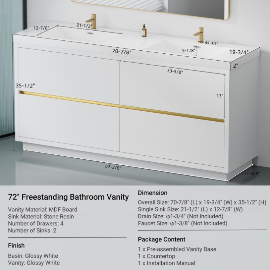 Overall Size: 70-7/8" (L) x 19-3/4" (W) x 35-1/2" (H) Sink Size: 21-1/2" (L) x 12-7/8" (W) Drain Size: φ1-3/4" Faucet Size: φ1-3/8" Finish: Glossy White Vanity Material: MDF Sink Material: Stone Resin Number of Drawers: 4 Number of Sinks: 2 Package Content 1 x Pre-assembled Vanity Base 1 x Countertop 1 x Installation Manual