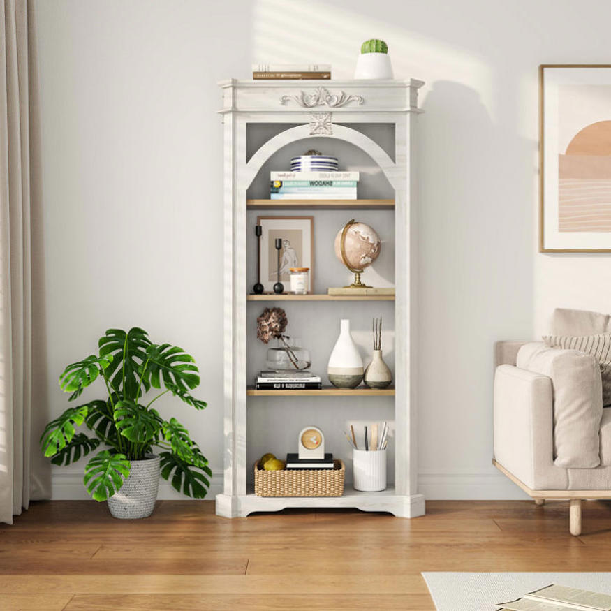the design of this shelving unit draws inspiration from classical aesthetics. The entire frame features a white vintage distressed finish, showcasing a unique texture that resembles the passage of time. Each carving is meticulously designed, with delicate patterns and curves that highlight the exquisite craftsmanship of traditional artistry, evoking a sense of historical grandeur.