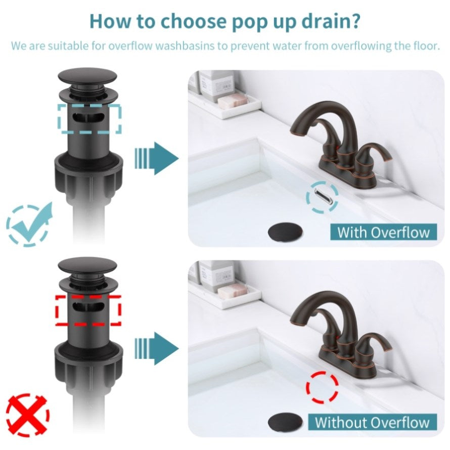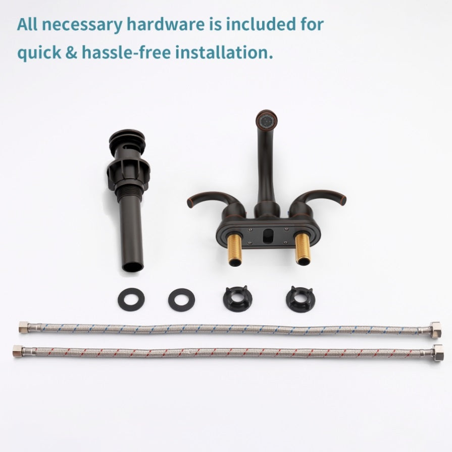 ♥EASY TO INSTALL: The Bathroom sink Faucet is 2/3-hole, 4inch centerset design with water supply hoses and plastic Pop-up Drain which is uses the standard universal ports, convenient and safe. Please read the instructions and product details before installation.
