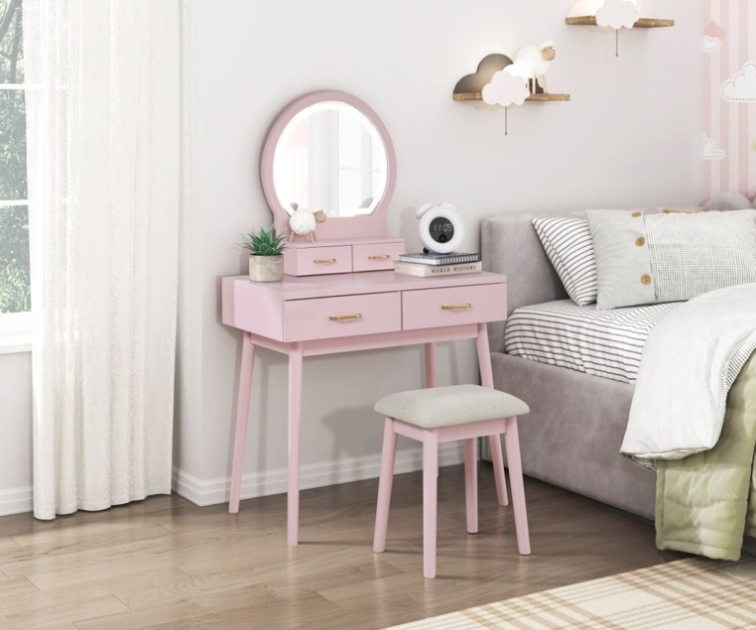 This charming pink vanity set is the perfect addition to any bedroom, offering both style and functionality. The set includes a vanity table with ample drawers for storage, a comfortable coordinating stool, and a clear mirror for effortless makeup application. The beautiful pink finish adds a touch of elegance and whimsy, creating a delightful space for beauty routines and self-care.