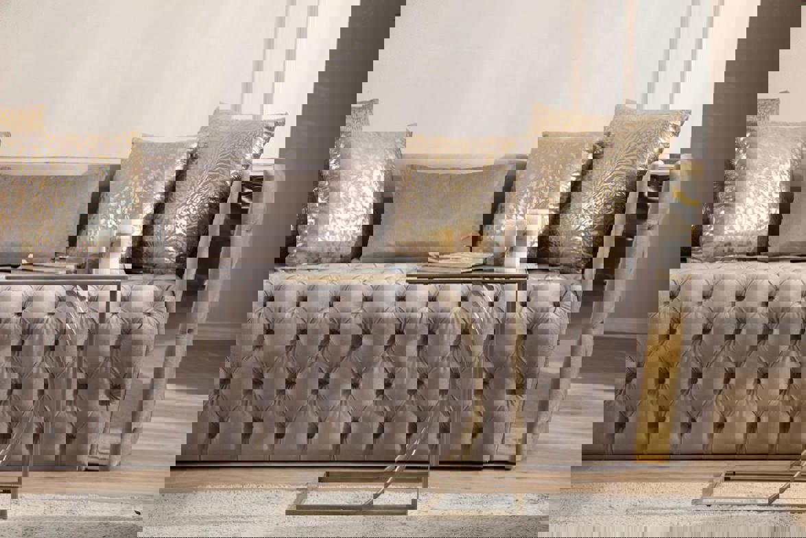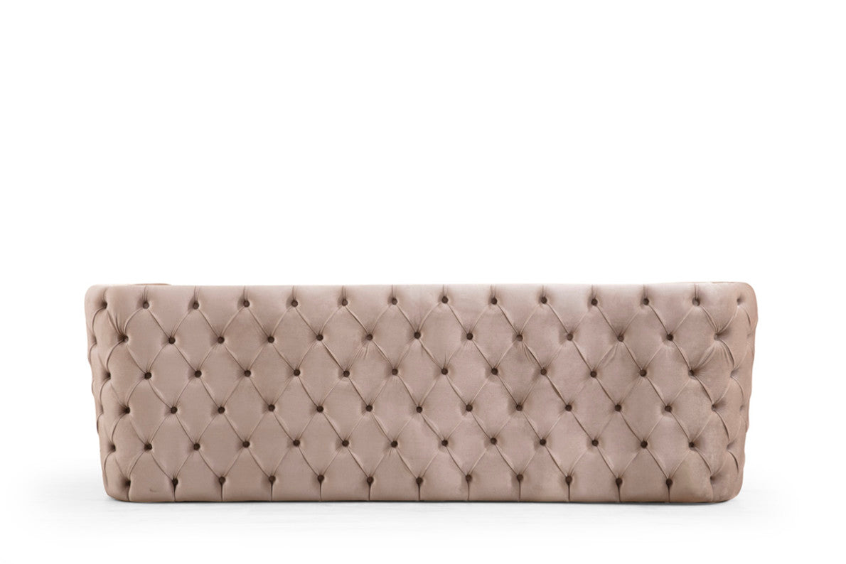 Button Tufted Sofa with Velvet Fabric and Gold Accent in Taupe B00961115