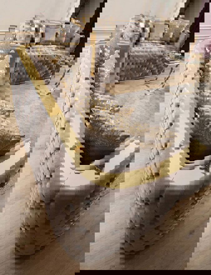 This modern transitional sofa is a masterpiece of design, blending luxury with comfort to transform your living room into a glamorous haven. Upholstered in sumptuous velvet fabric with button-tufting, it exudes an air of sophistication. The high-density foam fill with spring support ensures cozy seating, while the sleek arms and gold accents on the front add a touch of opulence. Accompanied by matching gold and black accent pillows, this sofa is not just a seating option but a statement piece that promises to last for years.