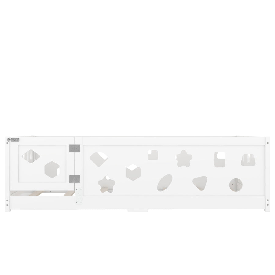 Combining practicality and creativity: This floor bed adds a unique and playful feeling to the child's room. The Fence with geometric shapesdesign enhances safety while stimulating imagination and creativity. This affordable bed integrates sleep and decoration, creating a multifunctional space that children will love.