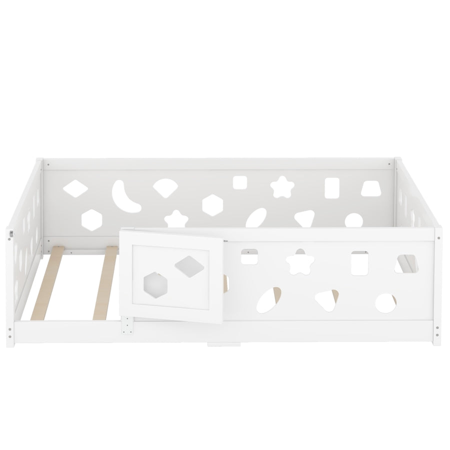 Full Size Floor Bed with Slats, Solid Wood Bedframe with Heightened Safety Guardrails and Door, for W1820P240543