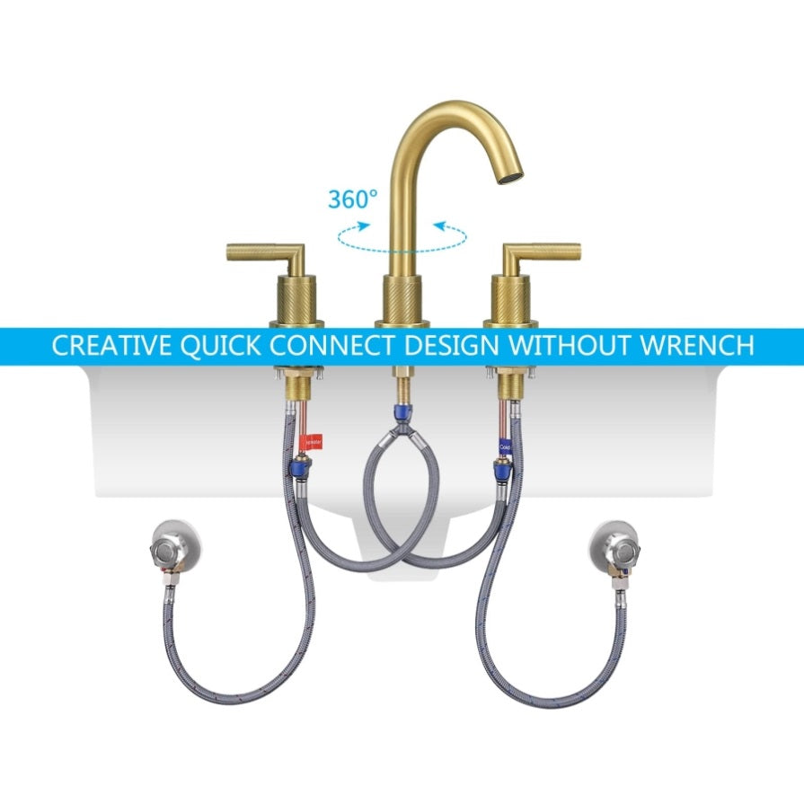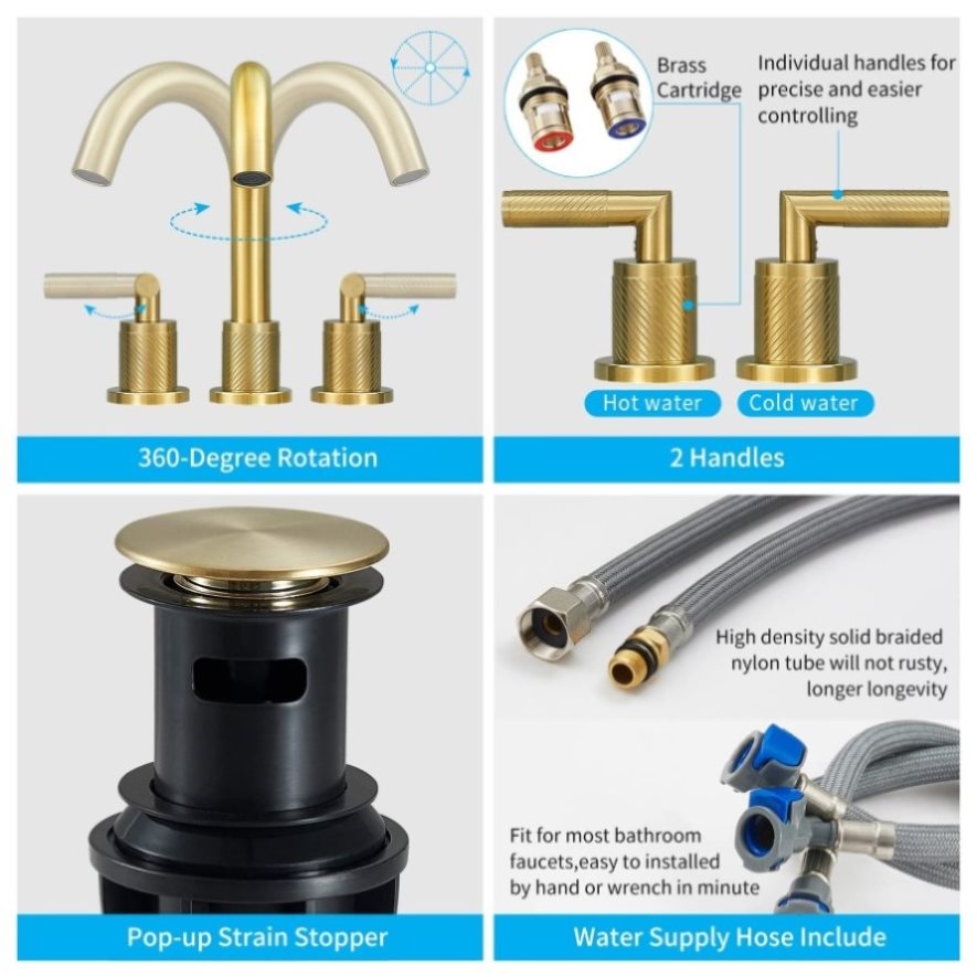 Our bathroom faucet is constructed with 304 stainless steel body and lead-free waterway, safe for your health in daily use. Brass gold finish provides fingerprint free, resist corrosion, Perfectly decorate your bathroom.Faucet DesignDual handle levers and 360 degrees rotate high spout design to precise control water temperature and flow. Widespread...