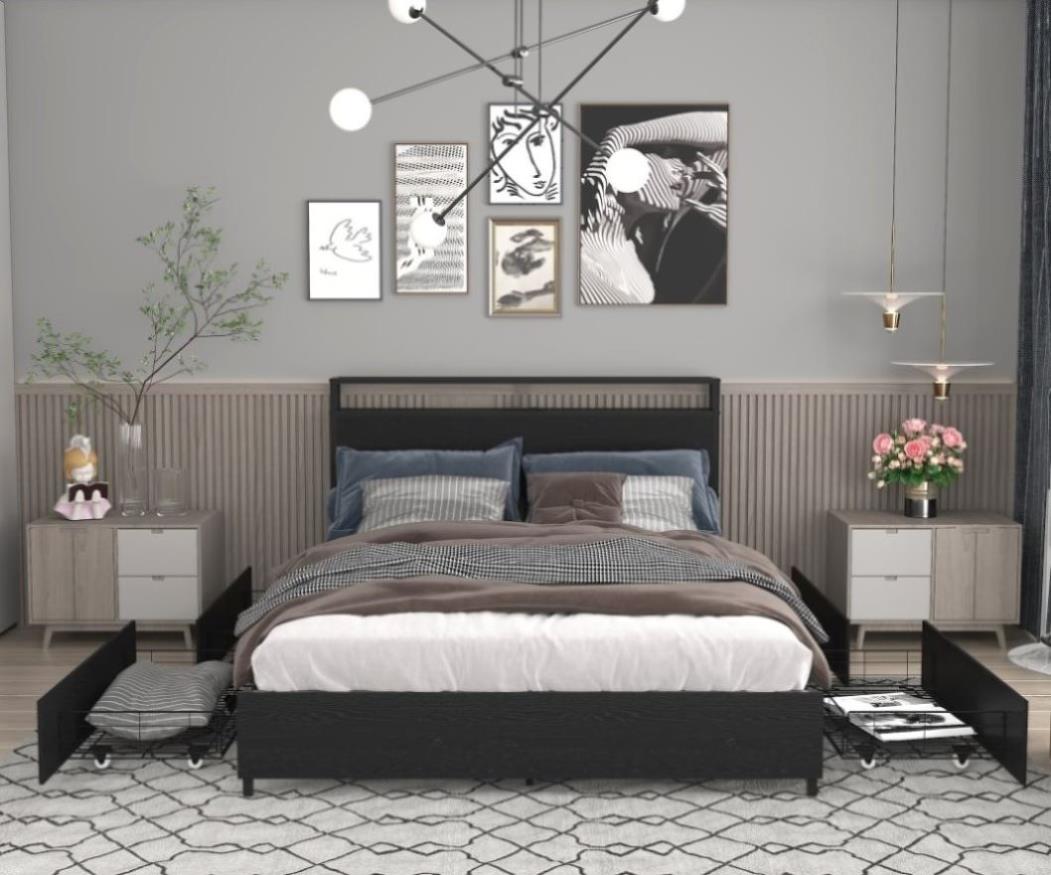Practical Storage Headboard - The headboard storage provides you with an extra place to store magazines, phones, beloved photos and decorations which is very practical.Practical Storage Bed 4 storage drawers provide ample storage space, perfect for storing clothing, pillows, sheets and bedding items. With pulleys, drawers slide in and out...