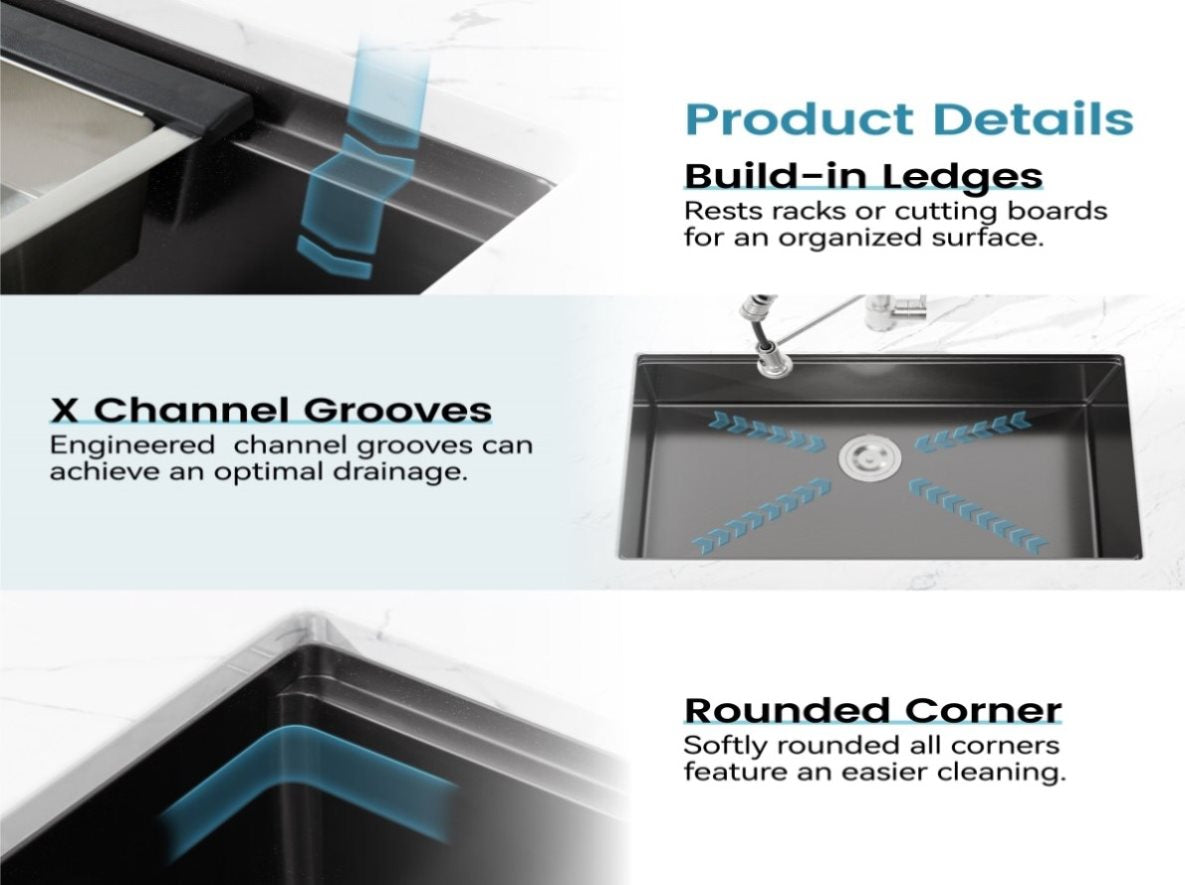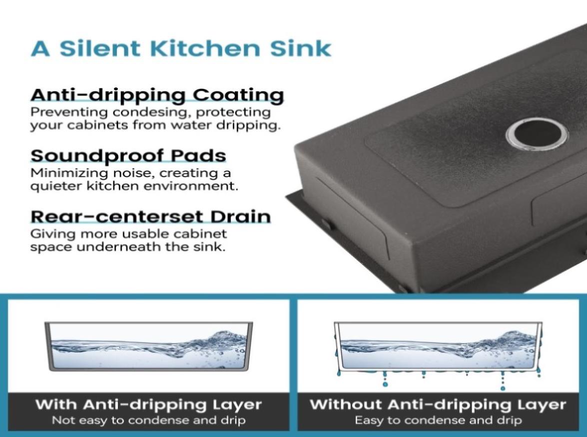 X-SHAPED DIVERSION DESIGN: The bottom of the sink adopts a scientific X-shaped diversion design which makes it fast, and effectively drain off water. EFFECTIVE NOISE REDUCTION: The outer side of the sink's bottom is not only covered with sound-dampening pads but also sprayed with damp-proof paint coating to achieve the effect of noise reduction and moisture absorption, making the sink quieter to use and reducing condensation at the bottom of the sink.