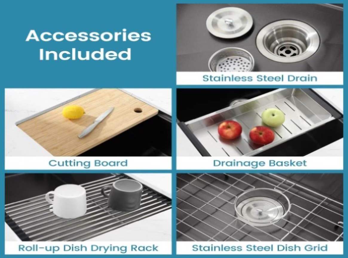 "Color Black Material 304 stainless steel Size 33x19x10 in Included Components: Dish Grid, Drain, Cutting Board, Drainage Basket, Roll-up Dish Drying Rack Style base sink Installation type base Finish type brushed Shape rectangle Drainage type grille 1 slot Net weight 27.45lb Product maintenance instructions: Wipe with a dry cloth Brush topcoat Pattern base sink Do you need a battery NoV"