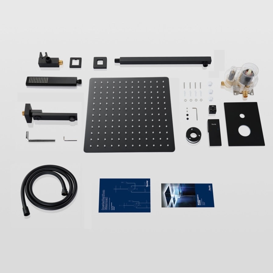 Easy To Install: Tenfe black shower fixtures are designed for easy installation with standard-sized NPT 1/2” tapered threads, compatible with most pipes types like: copper, PVC and PEX tubes etc. Shower Faucet Combo Included: 10 inch square rainfall shower head and arm, bathtub faucet, handheld shower head and holder, shower hose and accessories.