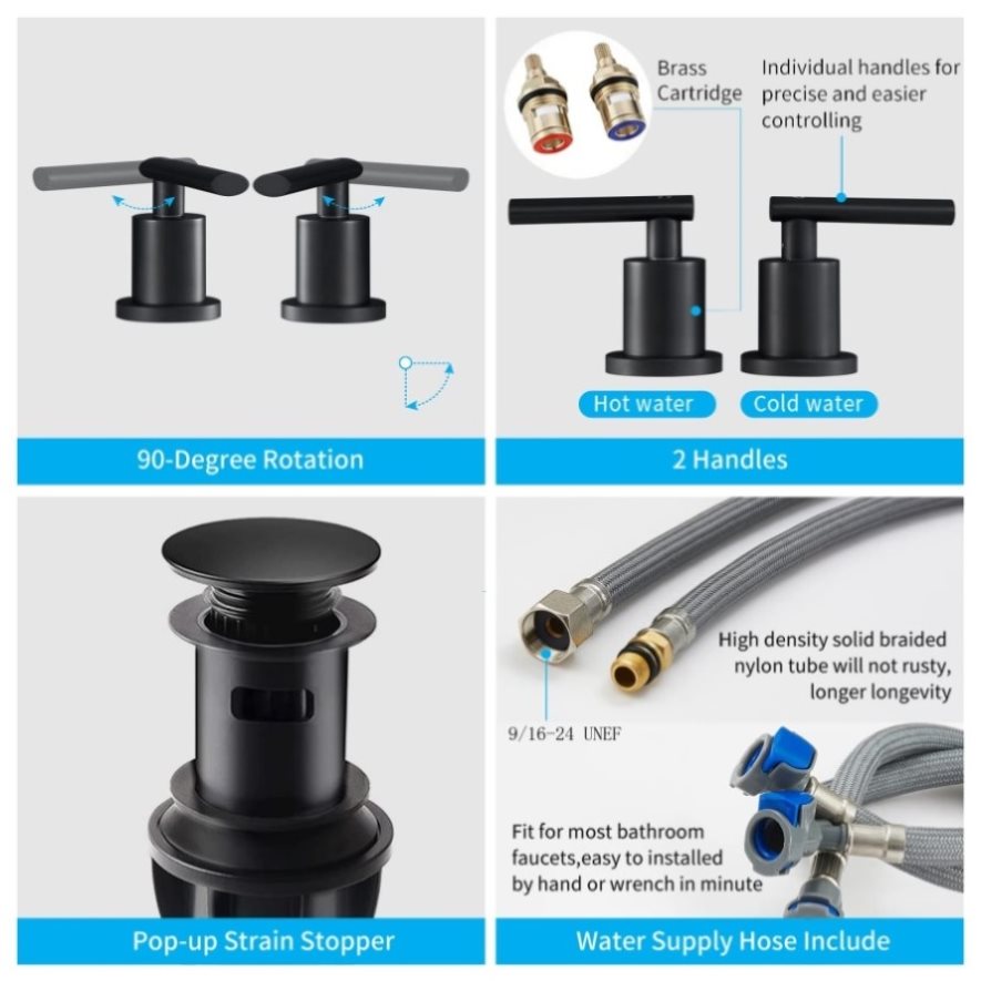 [Easy Installation] The Matte Black bathroom faucet comes with a plastic Pop up Sink Drain Assembly with Overflow and 2 high-density solid braided water supply hoses. All hardware required for installation is included in the package. Detailed installation instructions will guide you on how to perform installation quickly.