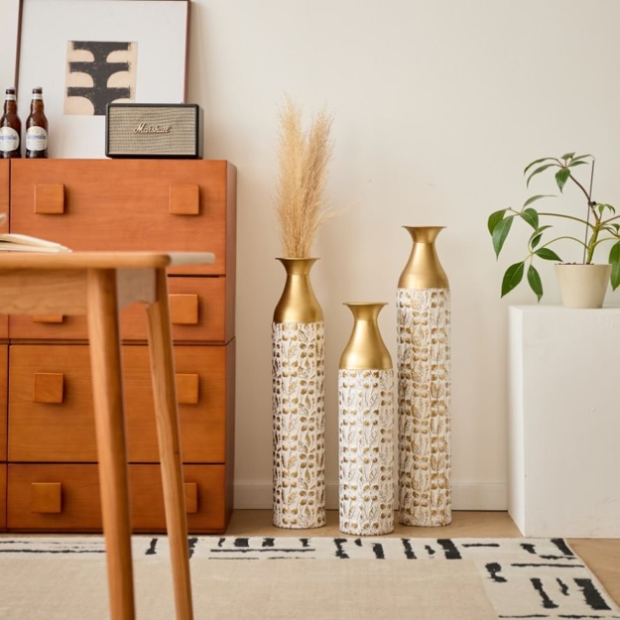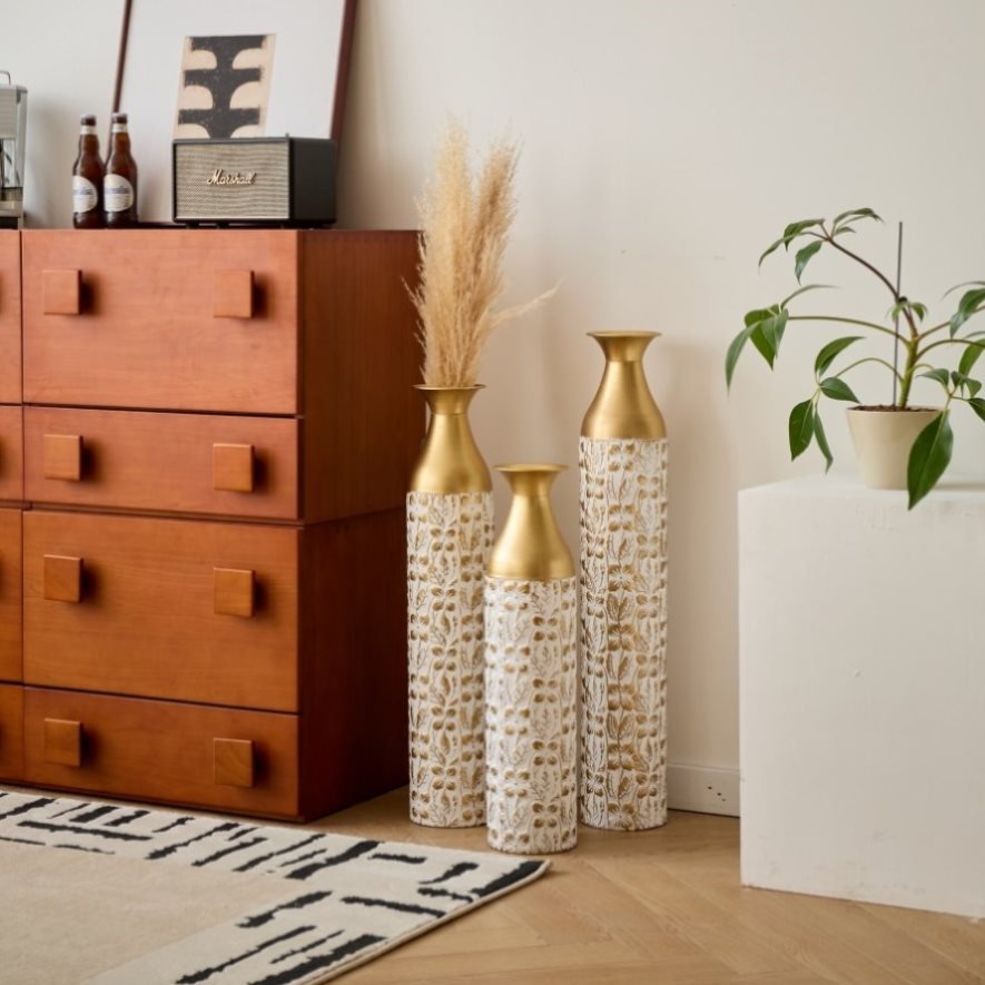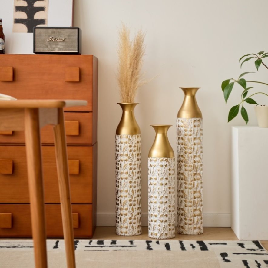 Decorative white vases: these tall metal vases feature a blend of polished and hammered gold finishes