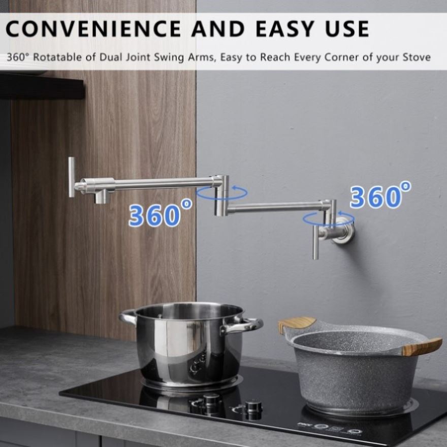 More Safe Leak Free Design:Brass Material,Ensures Durability and Easy Cleaning,with Dual Handles pot filler with Two ceramic valves provide smooth turning action and prevent dripping;with 1pc spare valve for future replacement. This Pot Filler Faucet arms can be 360° Rotation:Dual Jointed Swing Spout,Use for Only Cold Water or Only Hot Water,One Hole Inlet Wall Mount.