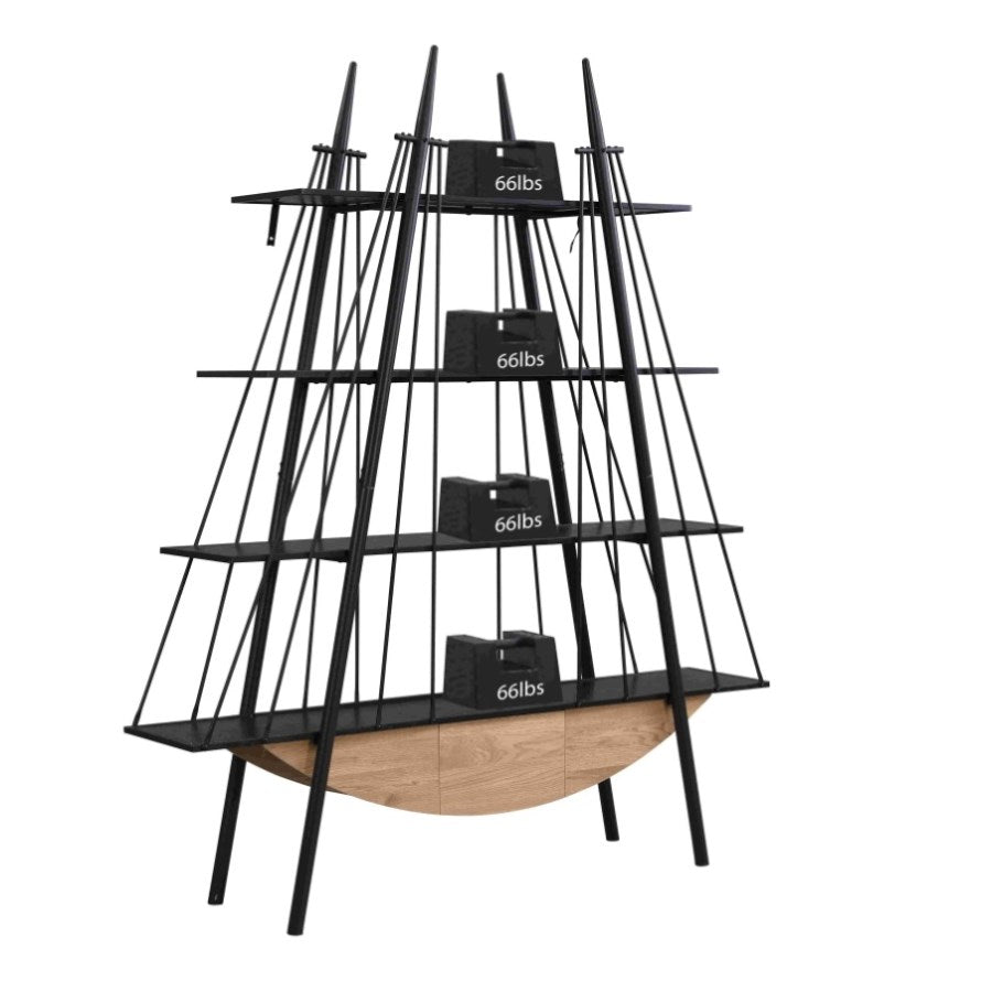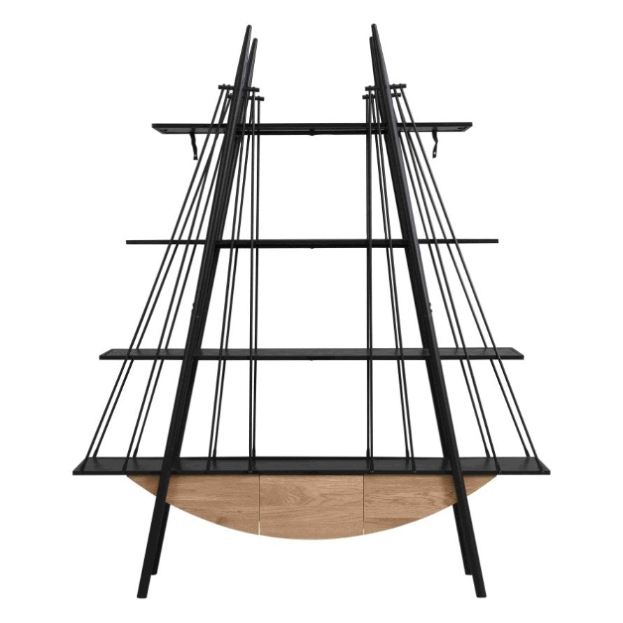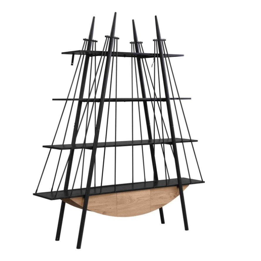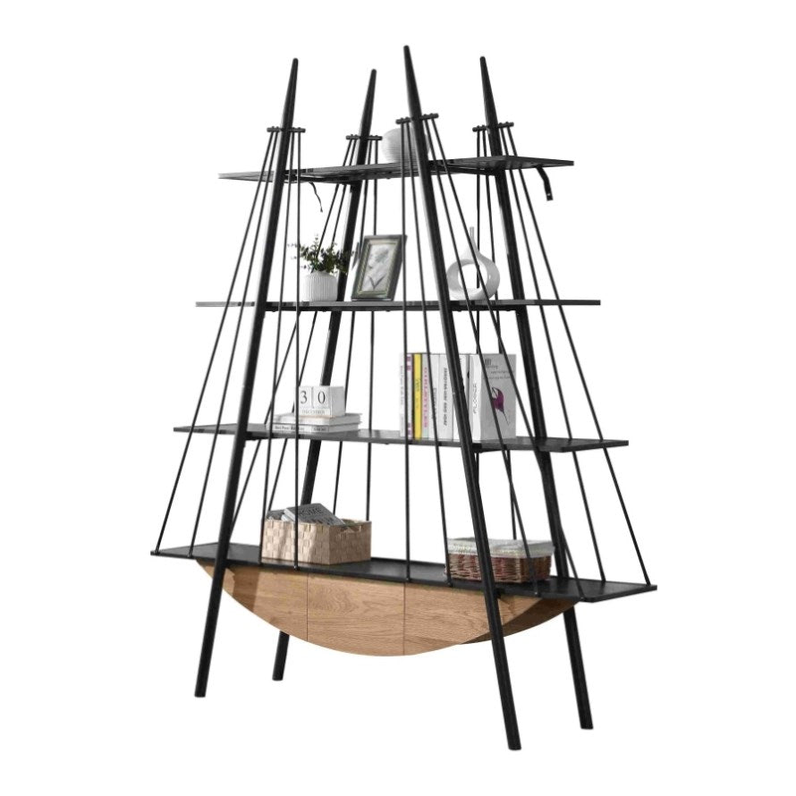 Sailboat-Inspired Industrial Design – This modern bookshelf features a unique sailboat-inspired structure, blending nautical aesthetics with industrial elements. Its distinctive design makes it a standout decorative and functional piece for any space.