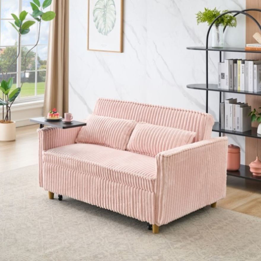 The pull-out push-in pink corduroy sofa with dual functions, equipped with a movable tabletop W1278P249022