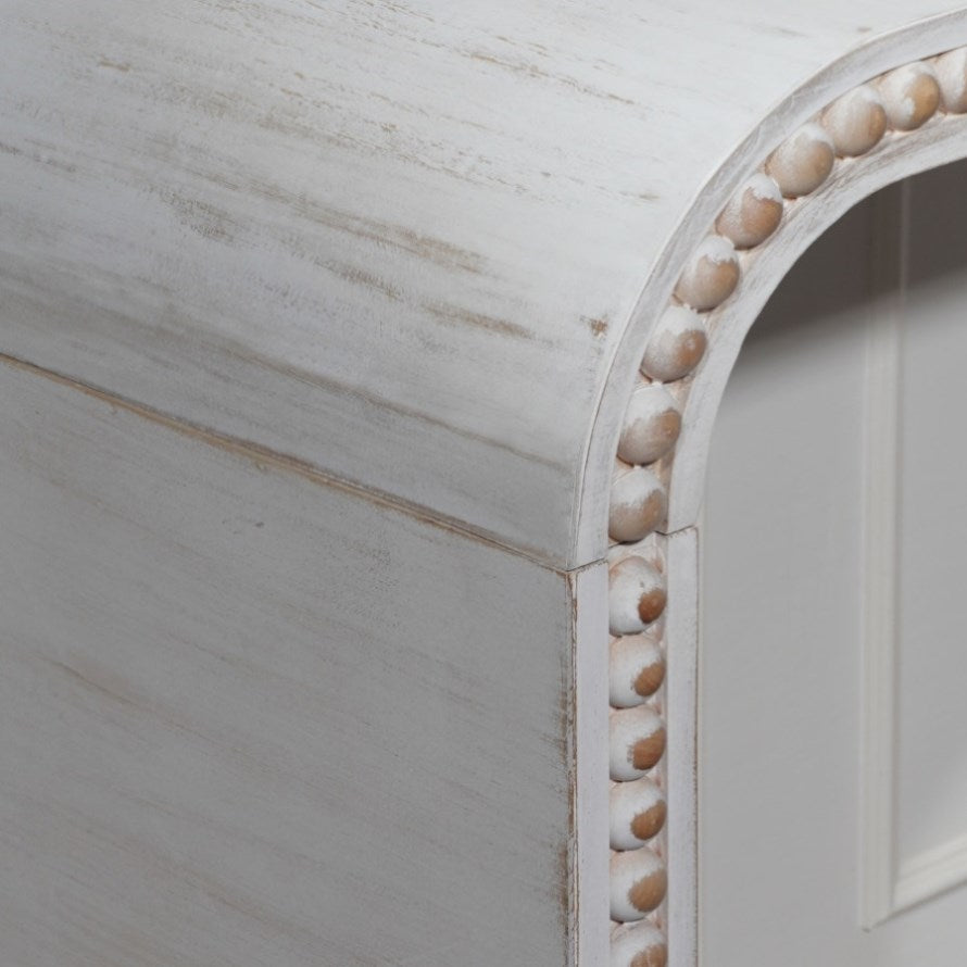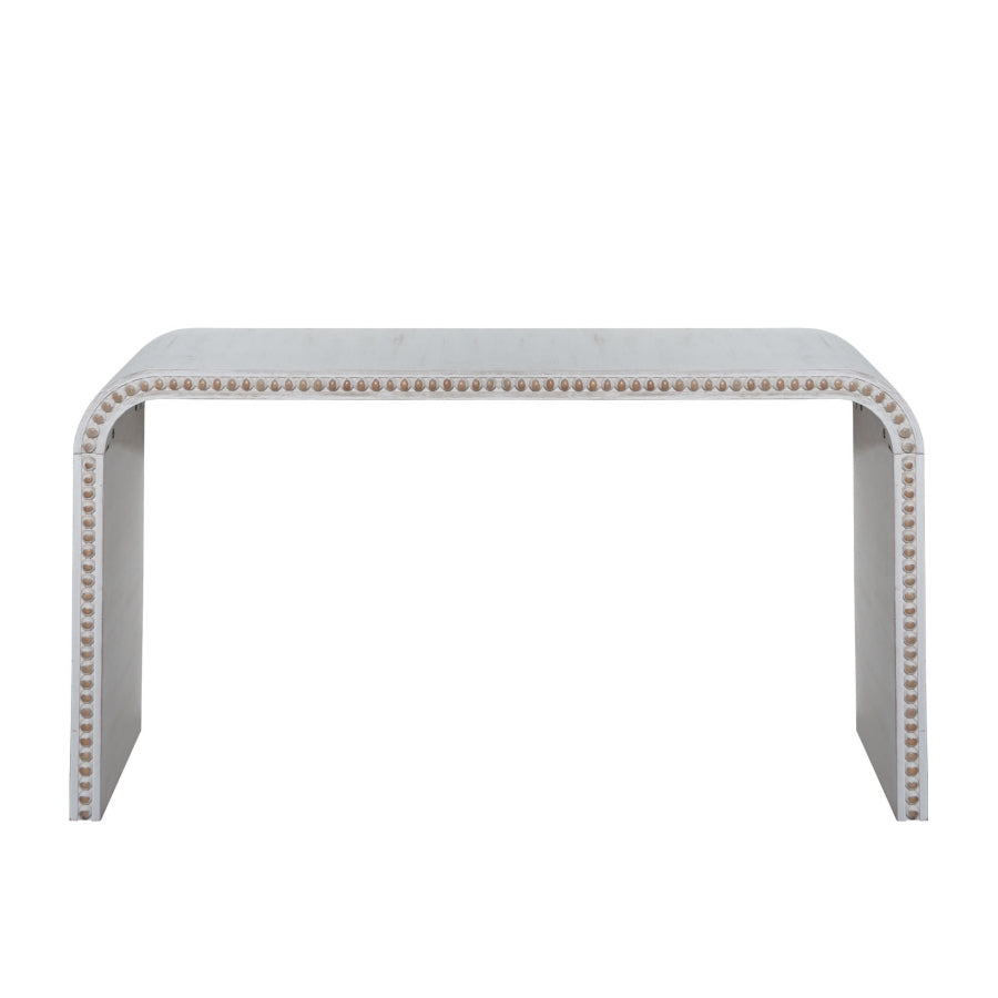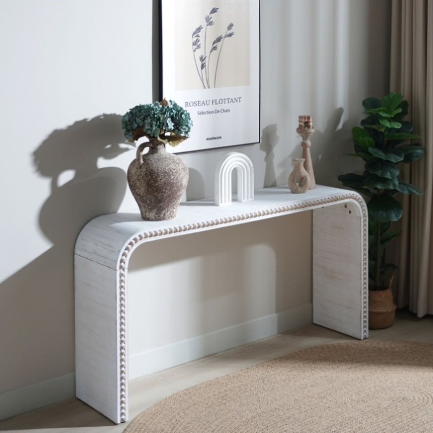 Enhance your living space with this beautifully designed washed white console table, featuring a sophisticated curved silhouette and intricate wooden bead detailing along the edges. Crafted from manufactured wood with a distressed white finish, this console table effortlessly blends rustic charm with modern elegance, making it a perfect addition to entryways, hallways, or living rooms.