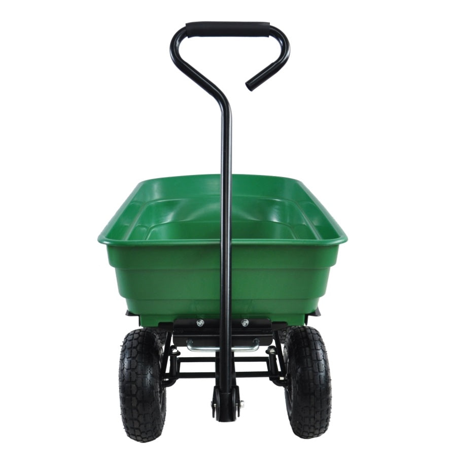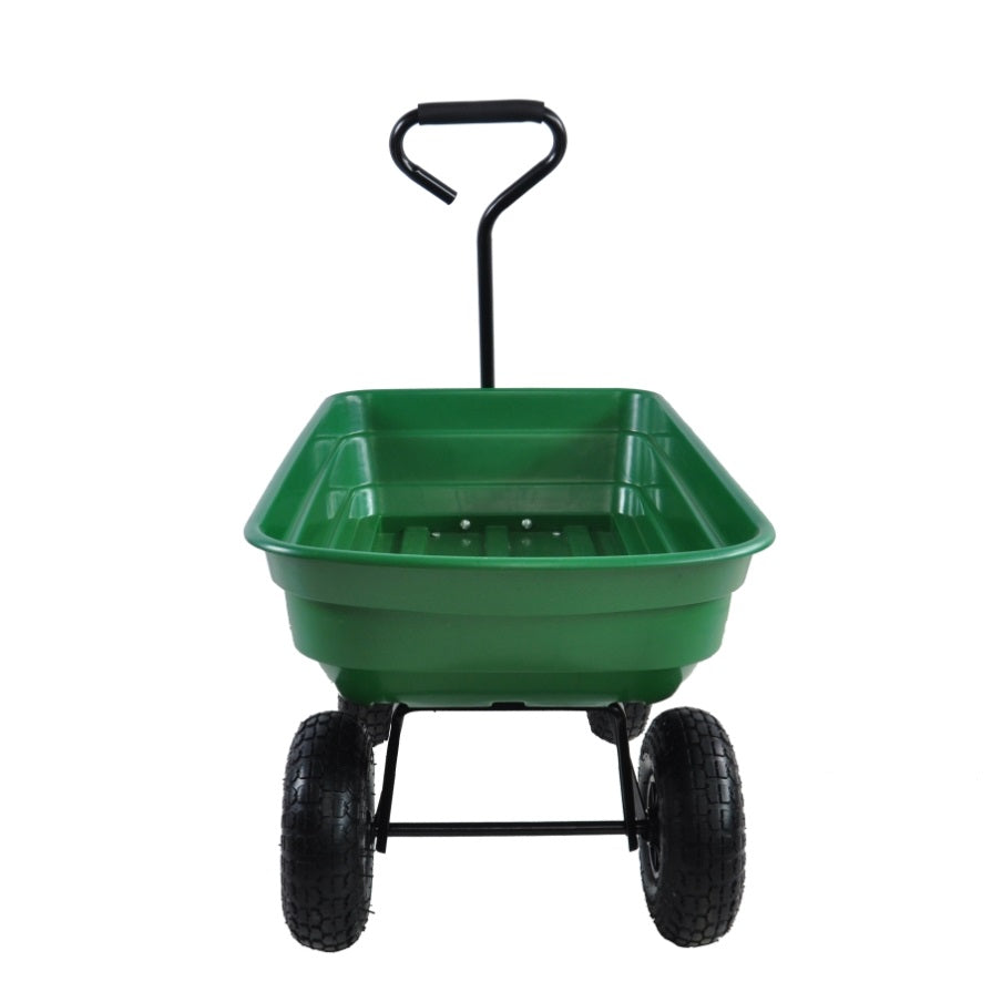 The Garden Wagon Cart vehicle is made of heavy plastic and durable steel frame. The soft sponge hand-holder protects your hands while pulling the cart. 10-inch pneumatic turf tires to tackle any terrain.