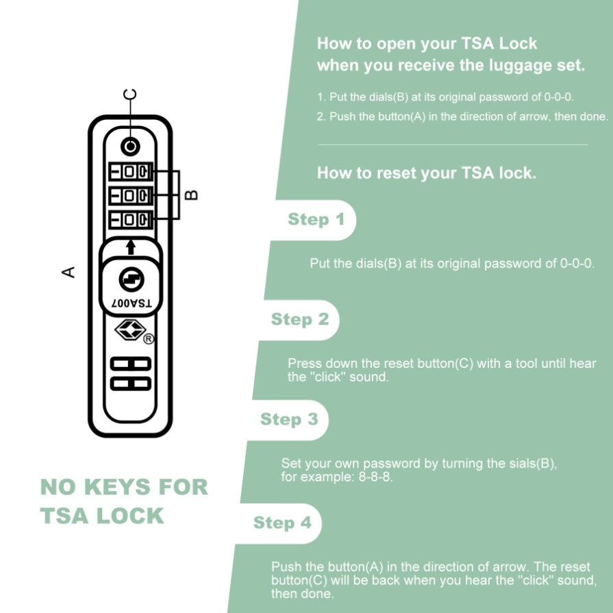 TSA lock allows only customs agents to inspect your luggage without damaging the lock and protects your stuffs in luggage and privacy more better. Simply set the combination. No keys are required.