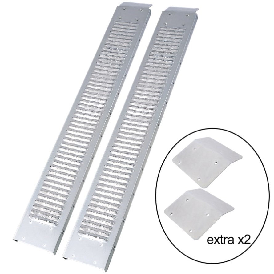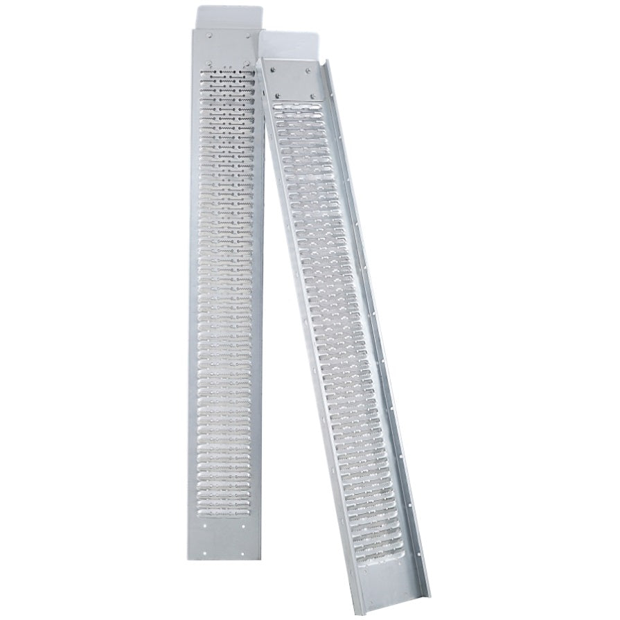 PRODUCT SPECIFICATIONS – Material: Steel. Dimensions: 69" L x 8-7/8" W x 2" H; The set includes two ramps, four foot plates, and necessary hardware.