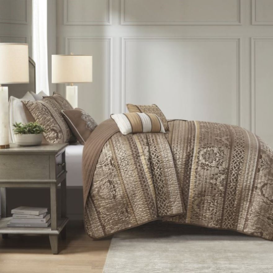 Set includes quilt, 2 shams, and 3 throw pillowsMade from high-quality polyester jacquard for durability and a luxurious feelFeatures leaf, striping, and ironwork motifs accentuated by ivory stitching on a brown basePops of gold throughout the collection add a lavish feeling to your décorThree decorative pillows feature pleating and embroidery...