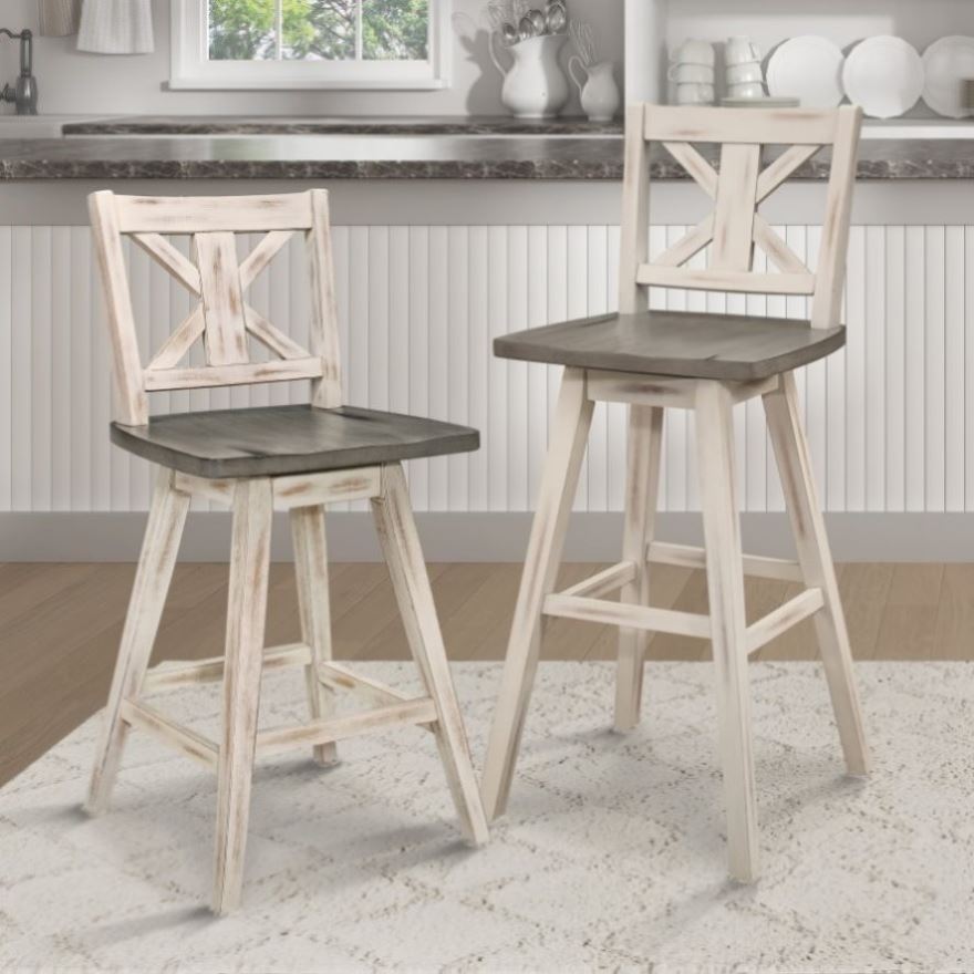 Creating a subtle rustic look for your dining space is the Amsonia Collection. A white sand-through finish graces the solid rubberwood 24-inch swivel X-back counter height chair, highlighting the veneer.