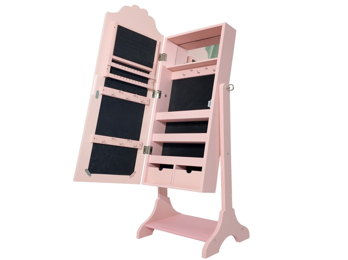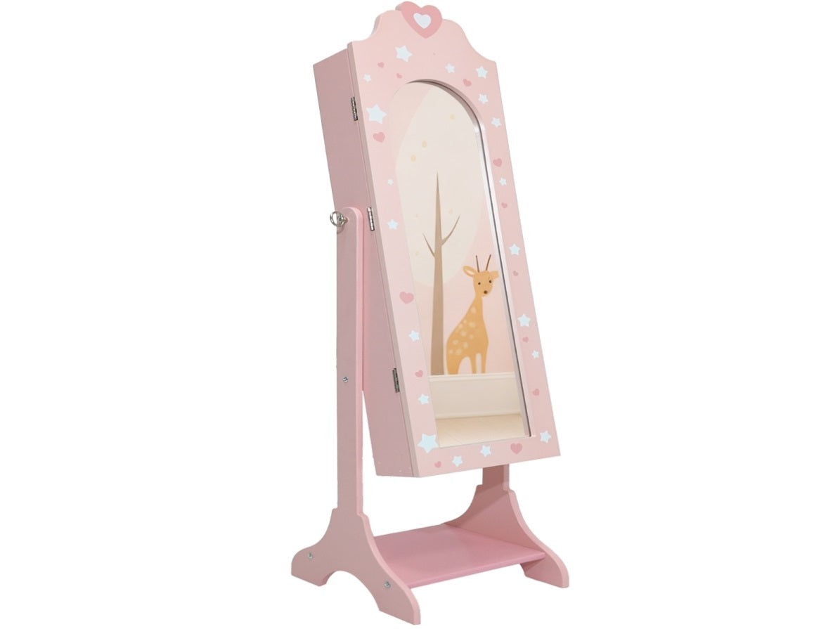 Introducing the charming Pink Love Hearts Children's Accessory Mirror Cabinet, a delightful and functional piece designed to organize your little one's treasures. Crafted from high-quality painted MDF, this elegant cabinet features a sweet pink color adorned with lovely heart motifs, creating a cheerful focal point in any child's room. The practical design includes a single door and a built-in shelf for versatile storage of hair accessories, jewelry, and keepsakes. With compact product dimensions of 31.50*30.00*116.00cm (9kg) and secure shipping dimensions of 102.00*35.50*18.00cm (9.8kg), it arrives ready to bring both order and whimsical charm to your child's space.