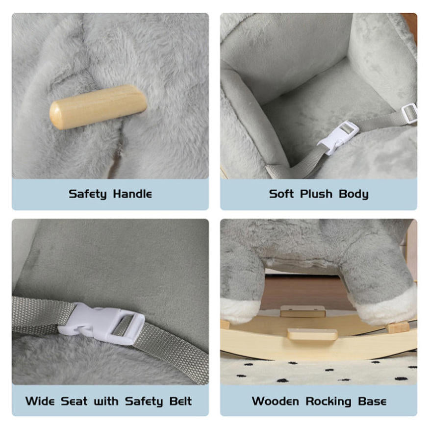 - Seat & Safety Belt: This Rocking Horse Toy has a wide and spacious, comfortable seat that to have cozy plush sides. The seatbelt, footrests, and handlebars keep your baby secure and ultra-safe, assisting their stability when rocking forward and backward.